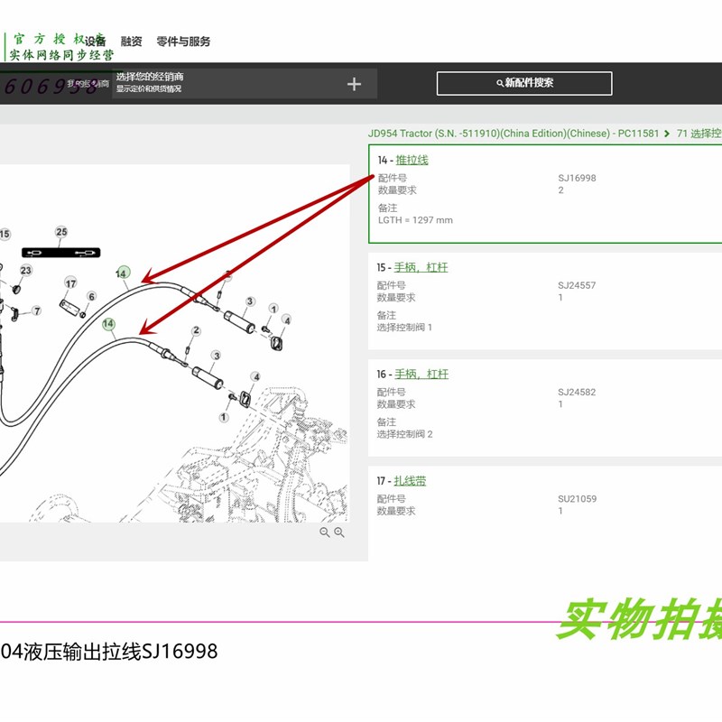 SJ16998约翰迪尔拖拉机原厂配件954 1204 1404液压输出拉线 包邮