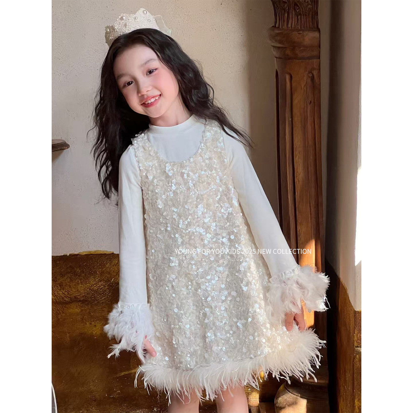 YFY秋冬女童羽毛亮片裙生日礼服公主裙连衣裙背心裙仙女裙气质