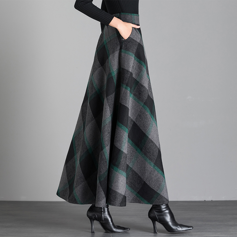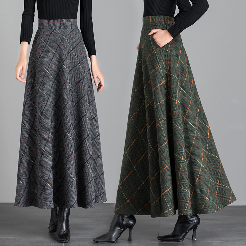 2025秋冬季新款百搭格子毛呢半身裙女高腰A字长裙大摆舞裙大码裙