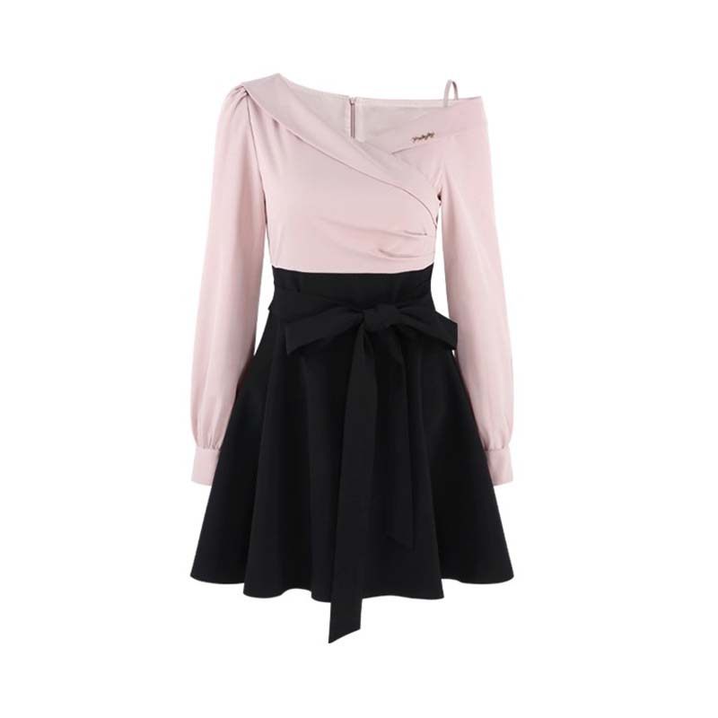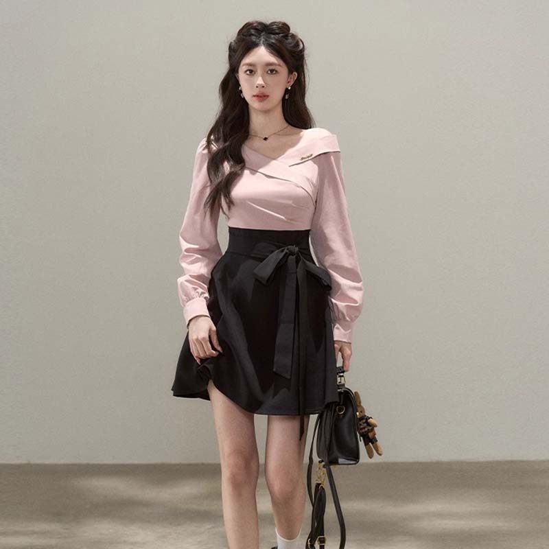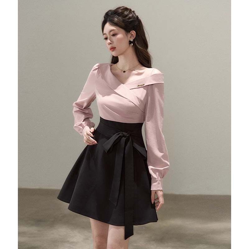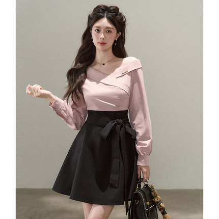 假两件v领斜肩长袖连衣裙女春秋高腰显瘦通勤a字短裙D3981