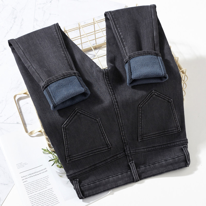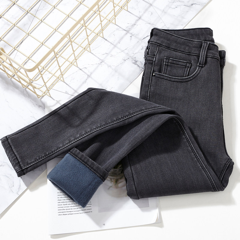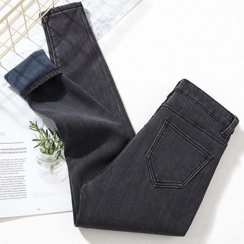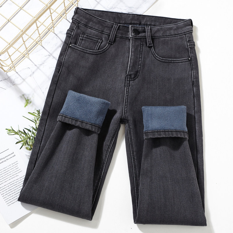 烟灰色加绒牛仔裤女秋冬新款高腰修身显瘦百搭薄绒紧身小脚长裤子