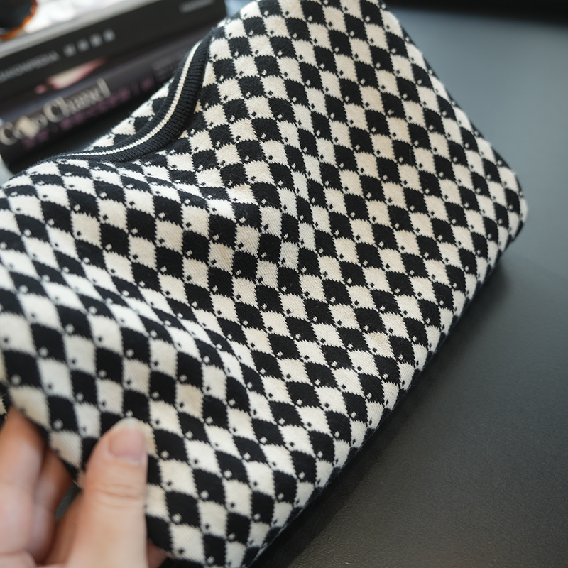 M家纯棉黑白菱格显瘦提花针织衫圆领短袖上衣女25秋季