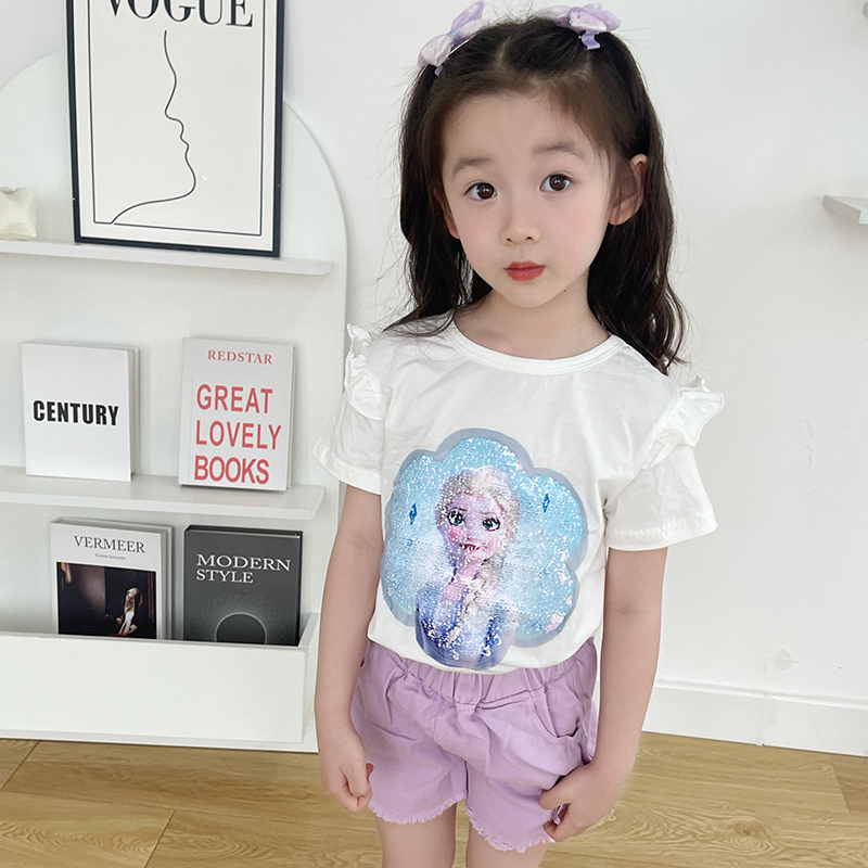 女童T恤爱莎公主卡通亮片变色女孩短袖上衣飞袖甜美中小儿童夏装