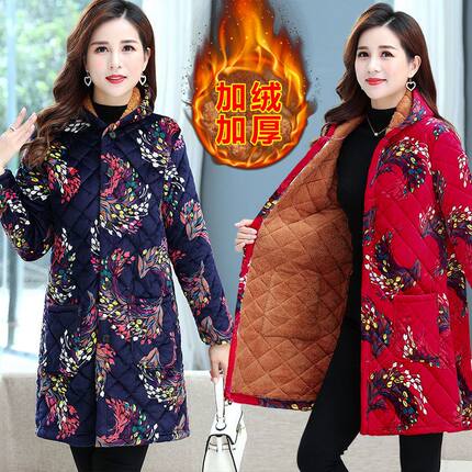四川省服妈妈装冬季加厚棉袄中长款印花中老年人女新款加厚棉大衣