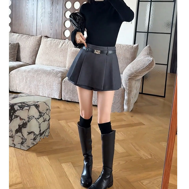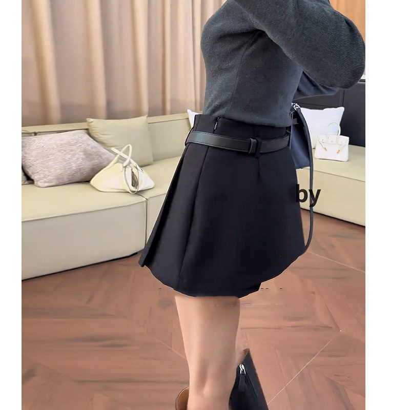 欧洲站2025秋冬款黑色高腰显瘦毛呢A字裙裤短裤百褶短裙半身裙女