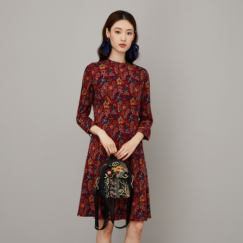 渔牌女装秋装女2023年新款立领印花碎花长款连衣裙子FGFD0036