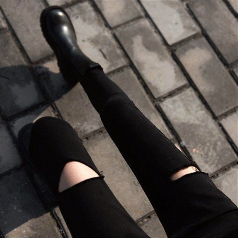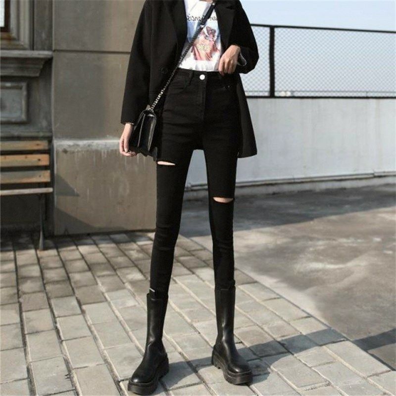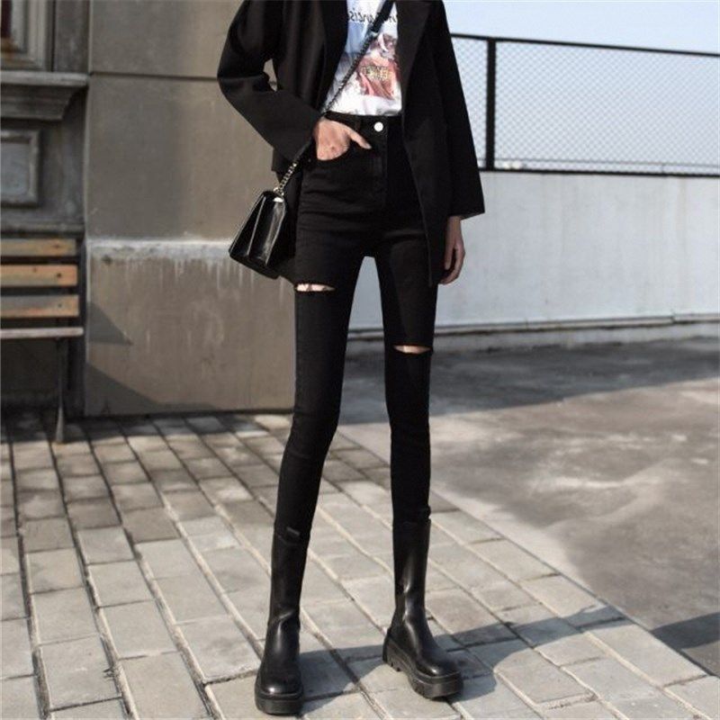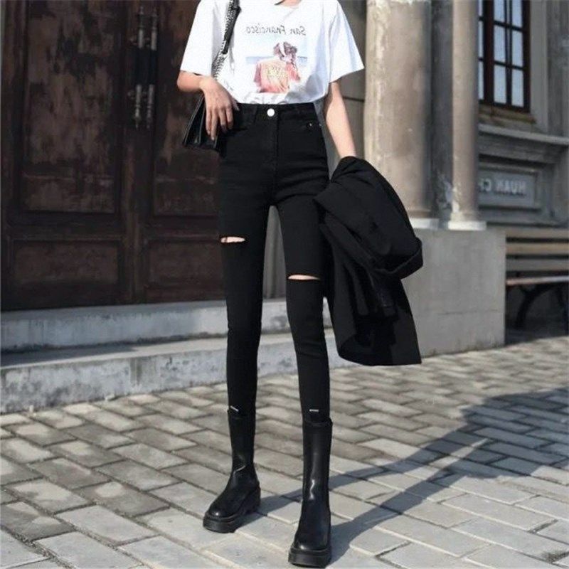 黑色高腰裤子女春秋潮显瘦百搭小个子紧身破洞九分小脚牛仔裤2024
