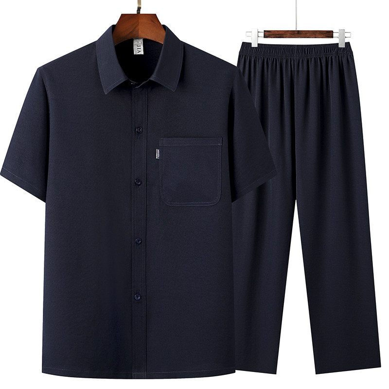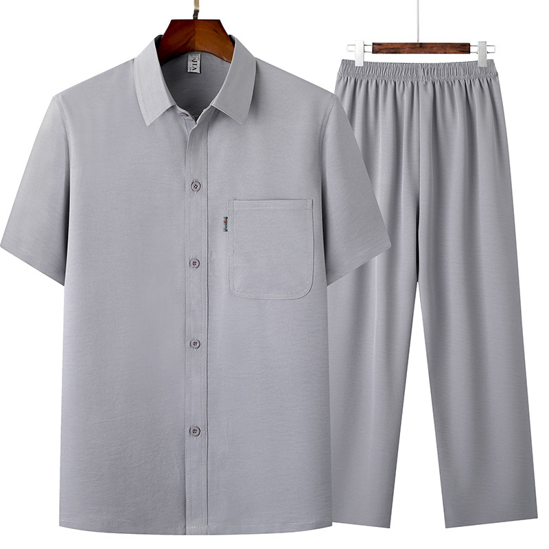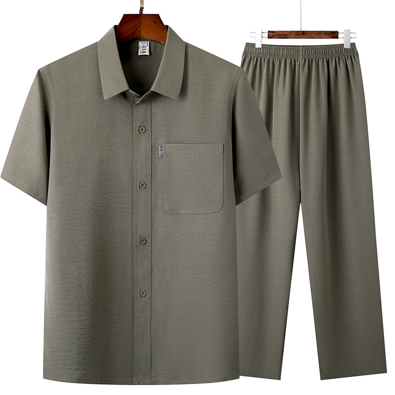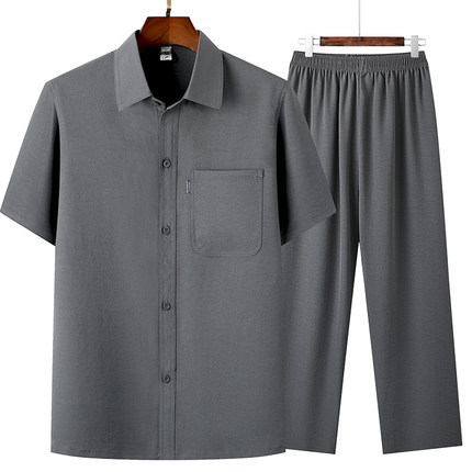 爸爸夏装两件套中老年人男士短袖衬衫60K岁爷爷装衬衫薄款休闲套