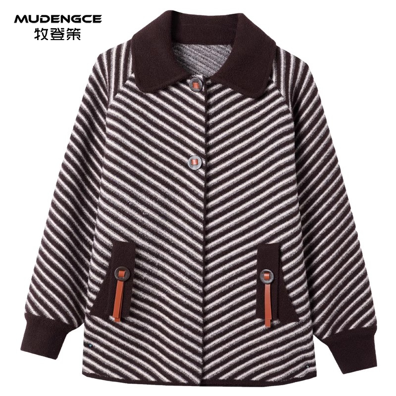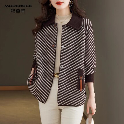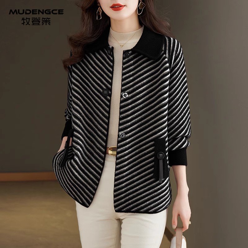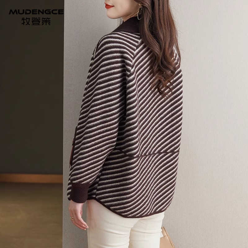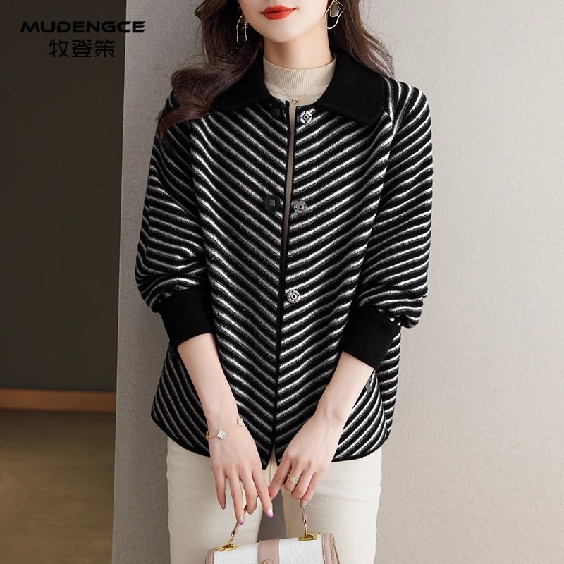 条纹短款外套女新款舒适翻领针织开衫韩系名媛宽松显瘦外搭上衣