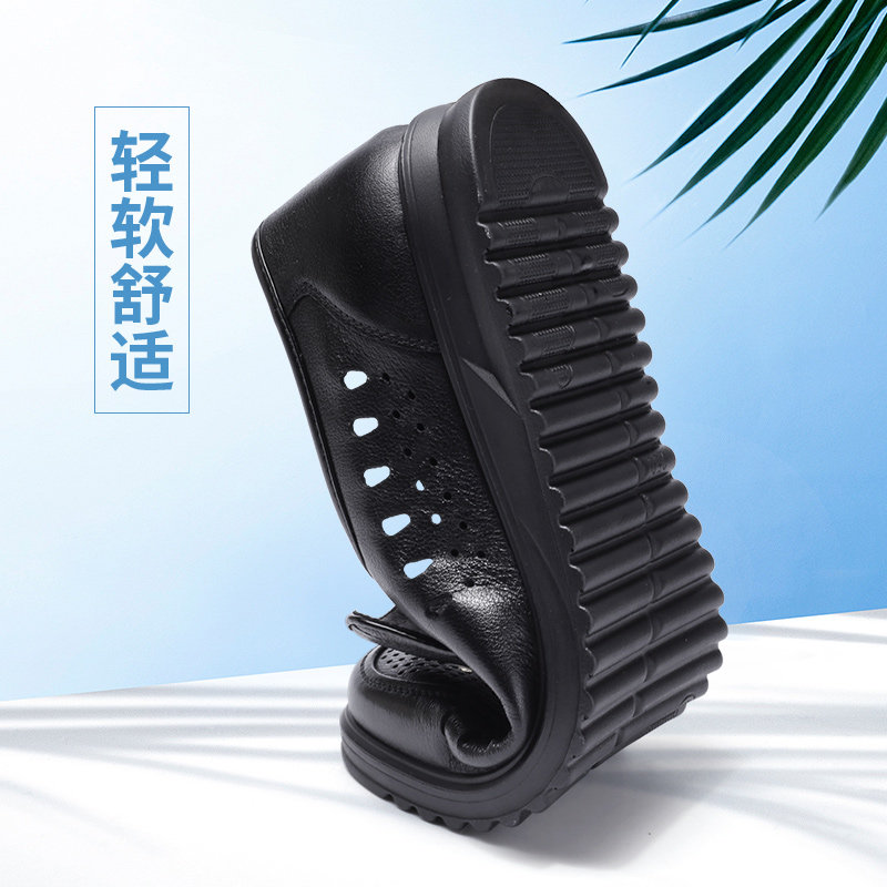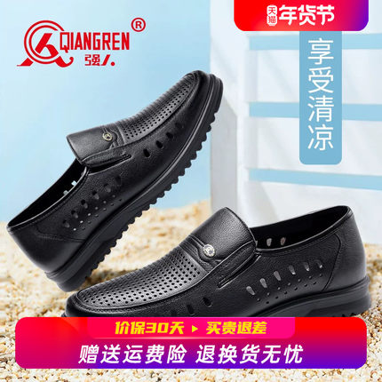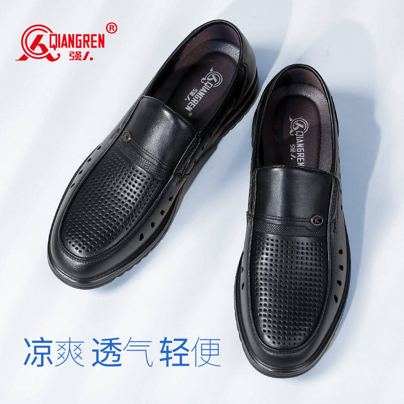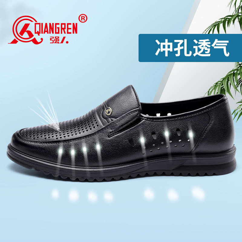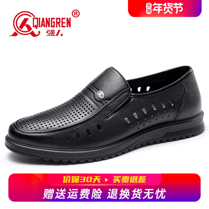 强人3515男鞋镂空夏季皮鞋男真皮透气休闲洞洞皮凉鞋男一脚蹬套脚