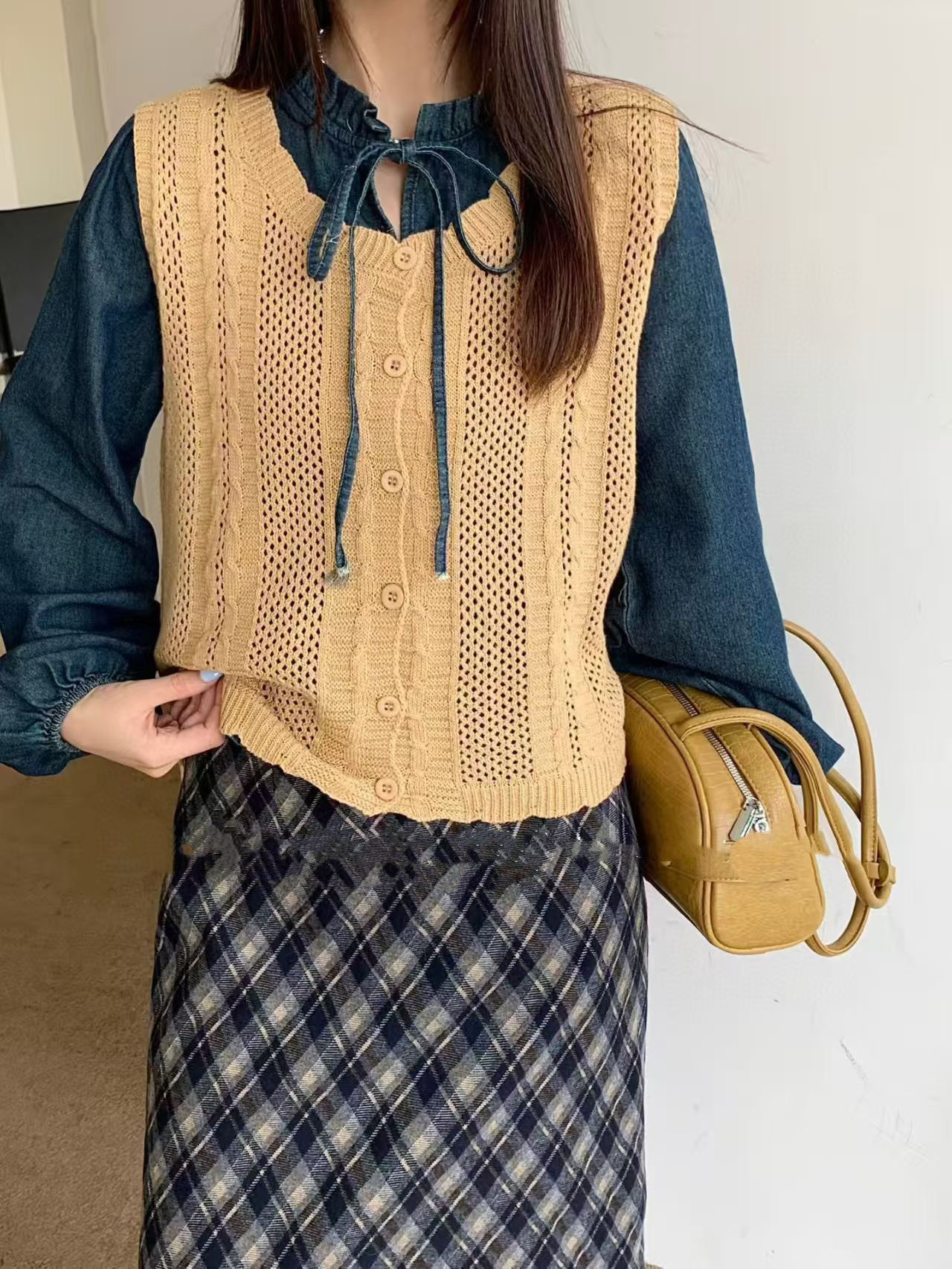 2025秋季新款高品质百搭圆领牛仔衬衫+无袖针织马甲女真2件套