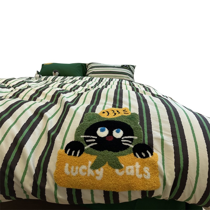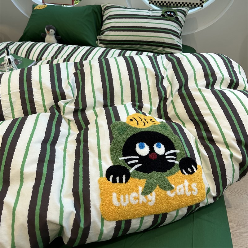 ins美式搞怪小猫毛巾绣纯棉四件套1.5m1.8宿舍公寓V被套床单三件