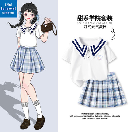 真维斯儿童学院风jk短裙夏装百褶裙短袖套装女童夏季洋气时髦童装
