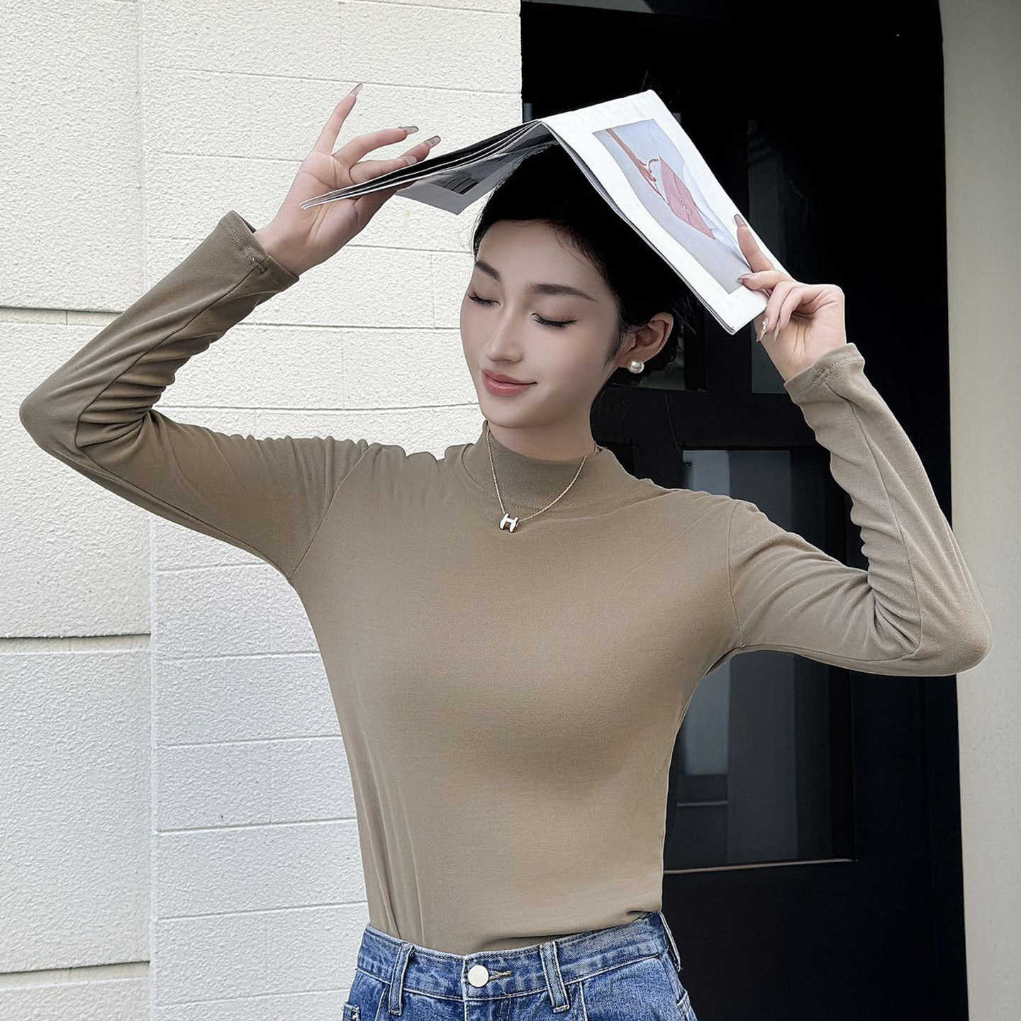 半高小立领打底衫女春秋内搭2025新款白色中领立领长袖t恤衫