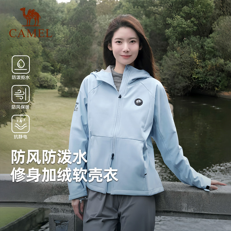 熊猫软壳衣女2025户外冬季新款防泼水修身显瘦摇粒绒百搭连帽外套