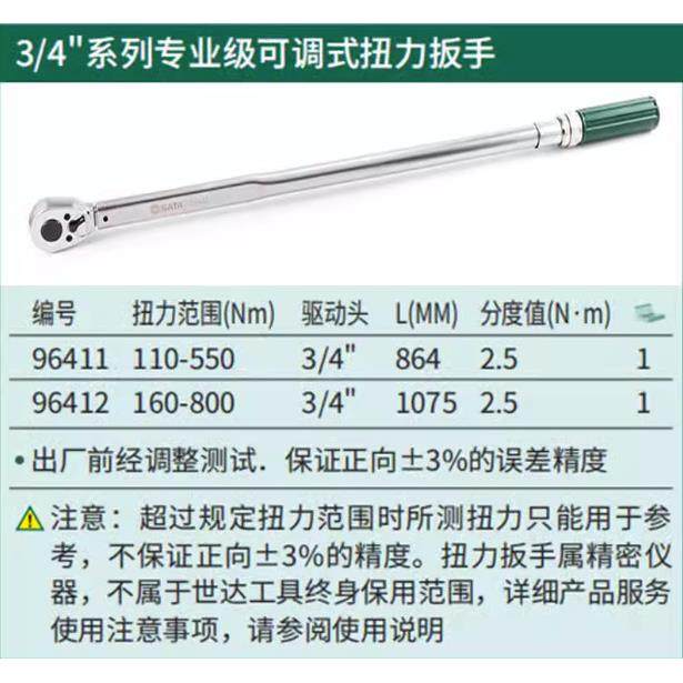 世达3/4可调式扭力扳手96411-96412重型力矩扳子110-550-800扭米