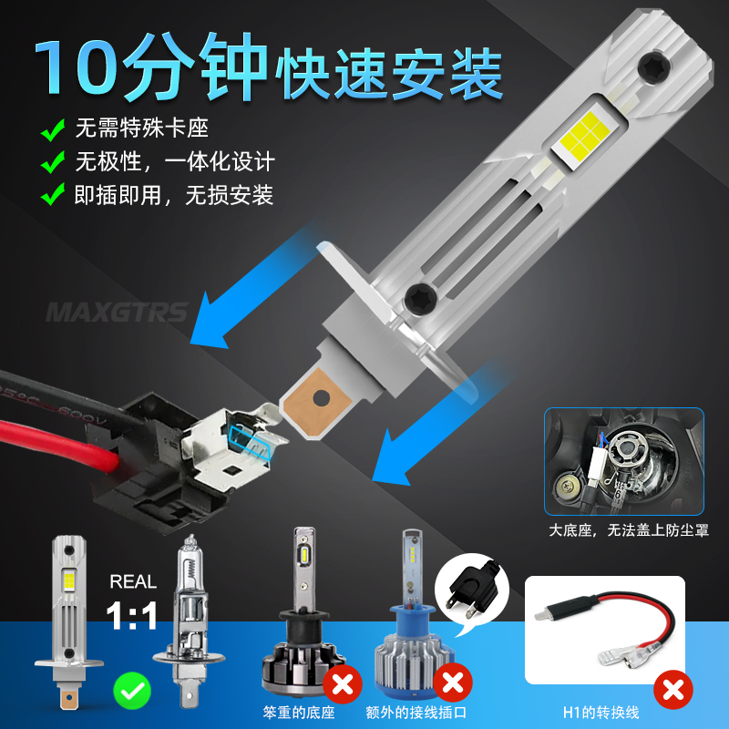 12V汽车LED远近光24V大灯H1无线一体大功率1:1超亮即插暖白雾灯