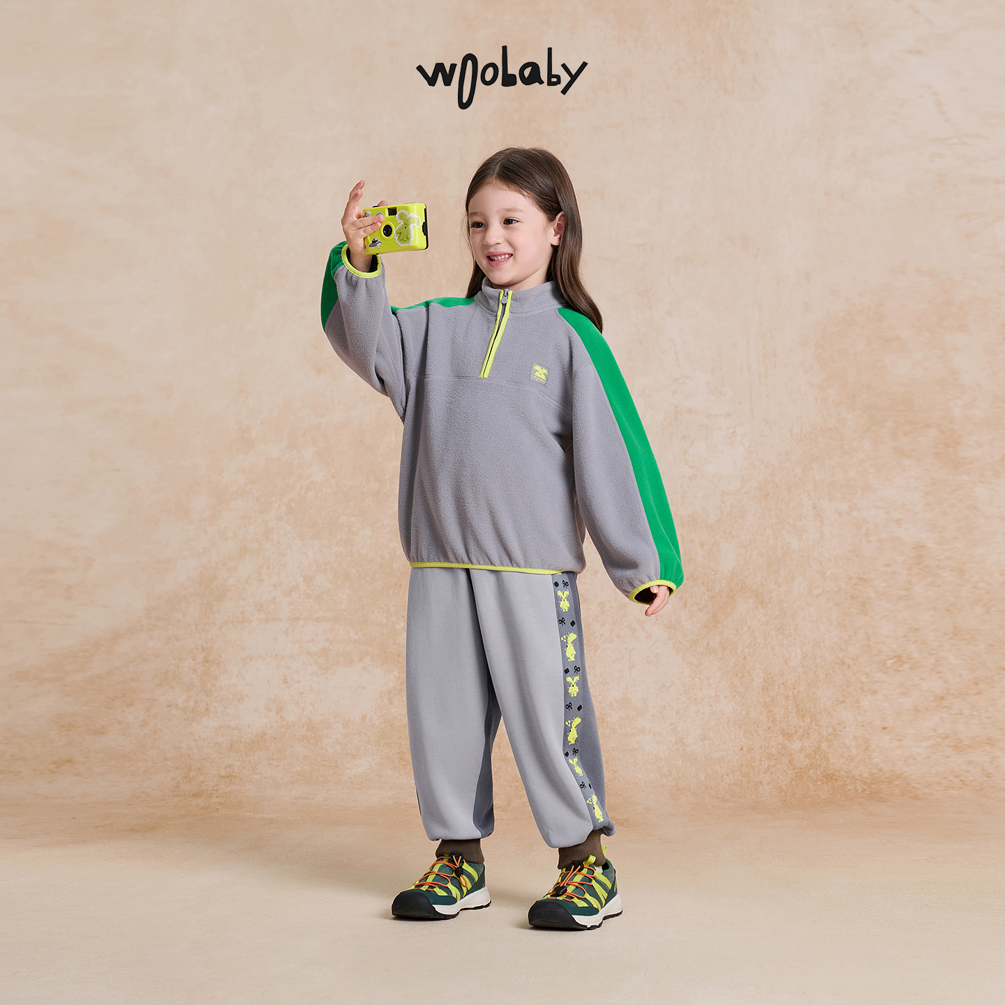 [内里加绒]woobaby儿童裤子男童女童25冬新品撞色织带运动长裤