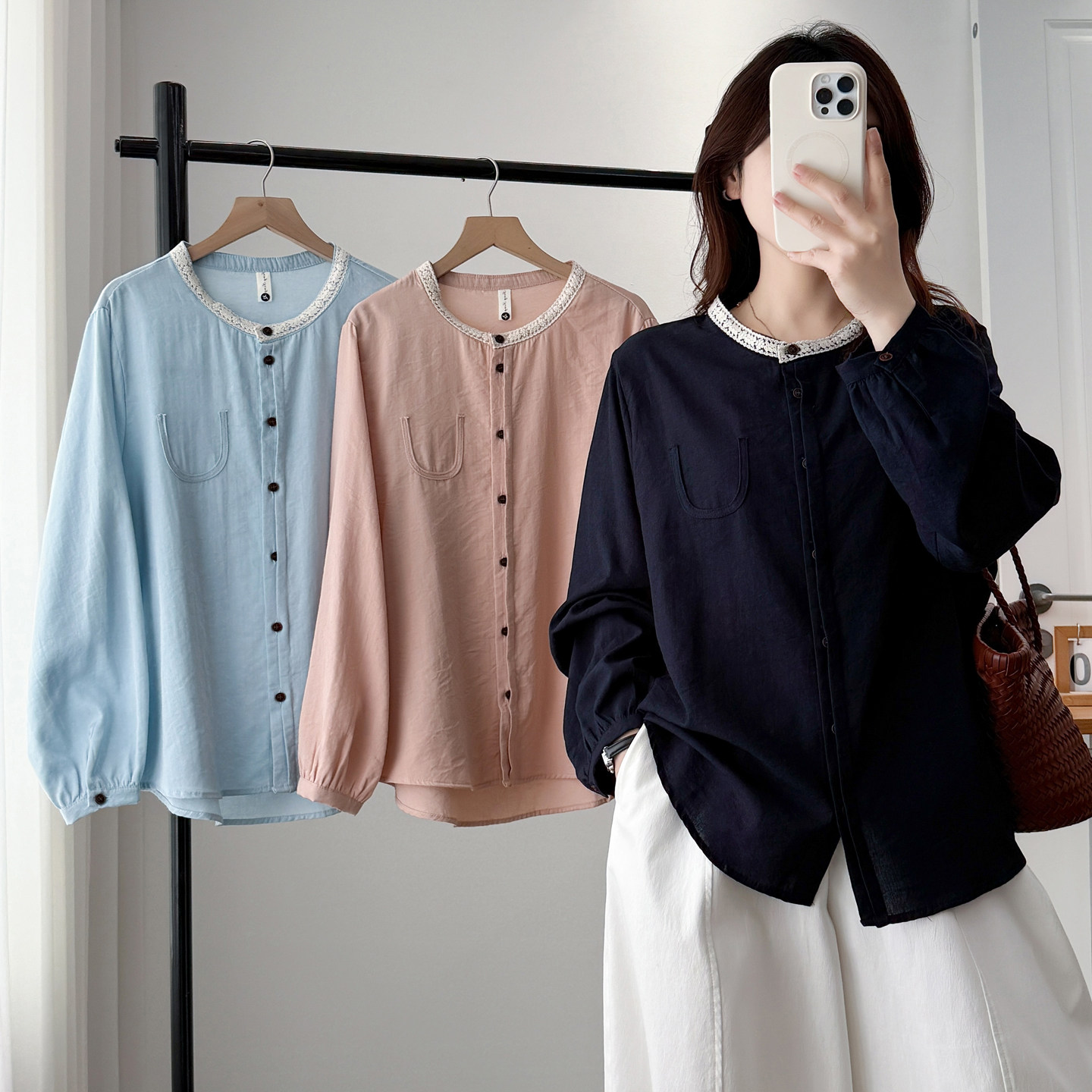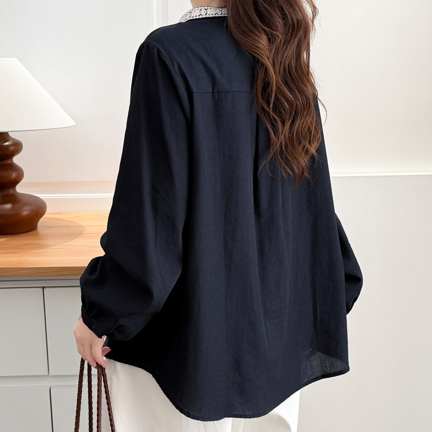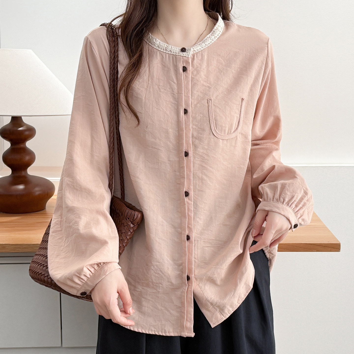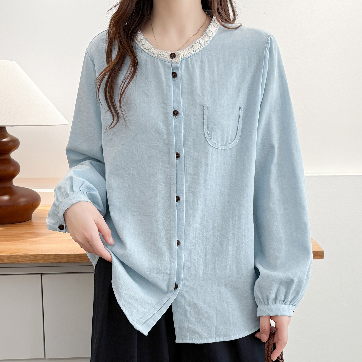 大码女装蕾丝花边领长袖衬衫上衣