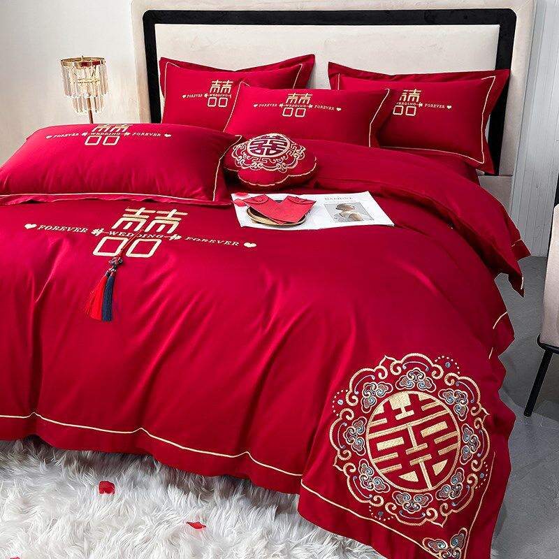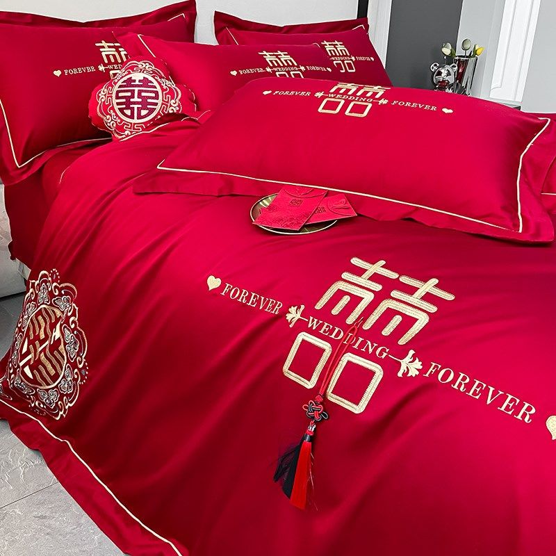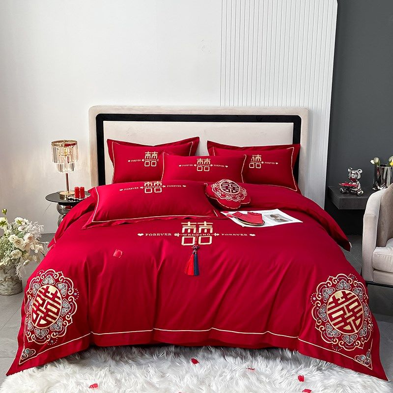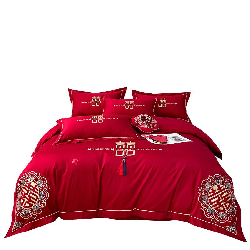 婚庆四件套大红刺绣喜被六件套新结婚婚房嫁全棉床单床上用品