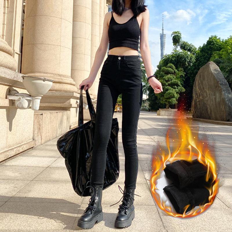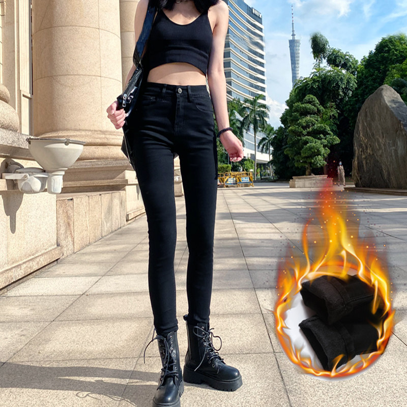 加绒牛仔裤女九分小脚裤2022秋冬新款高腰显瘦显高纯黑色紧身长裤