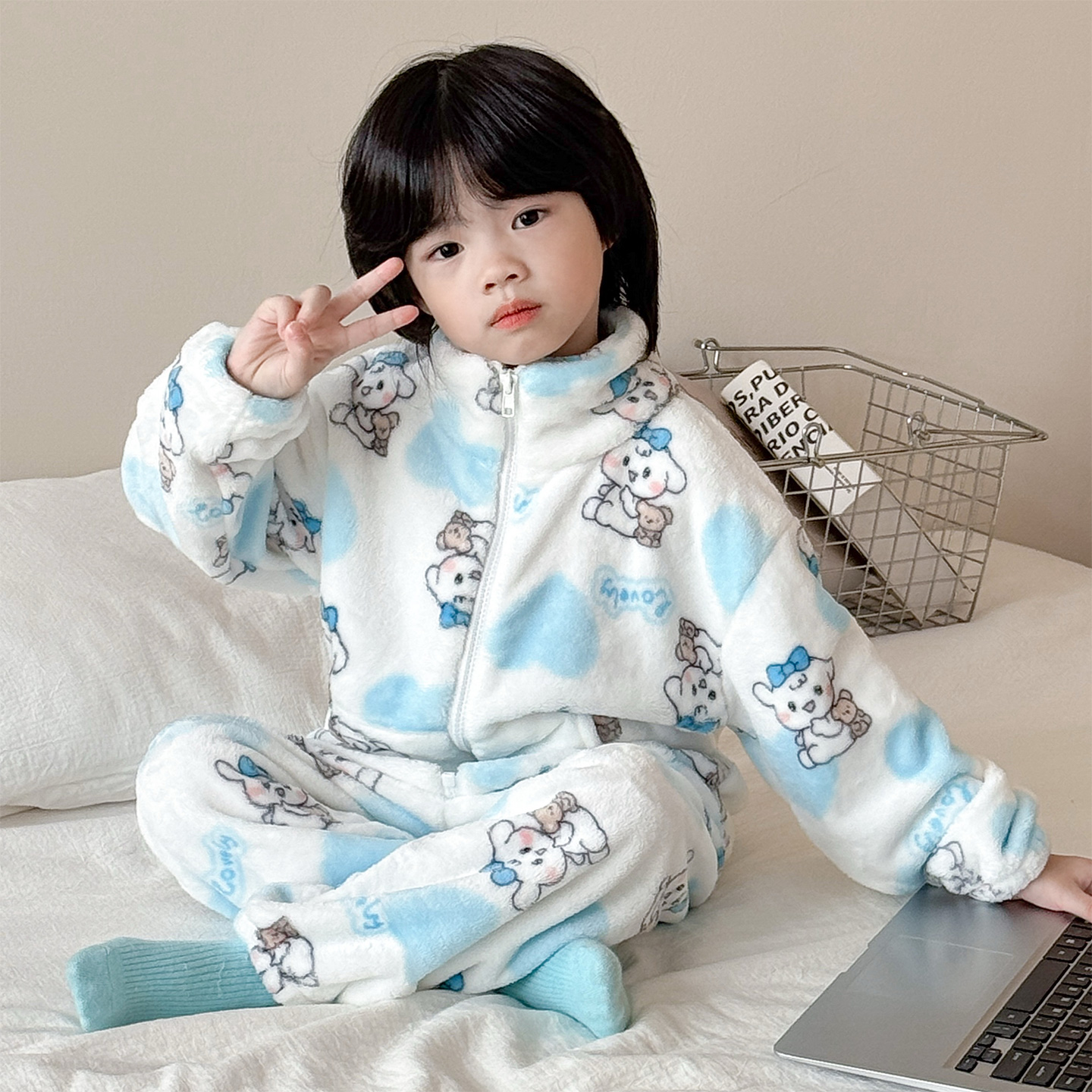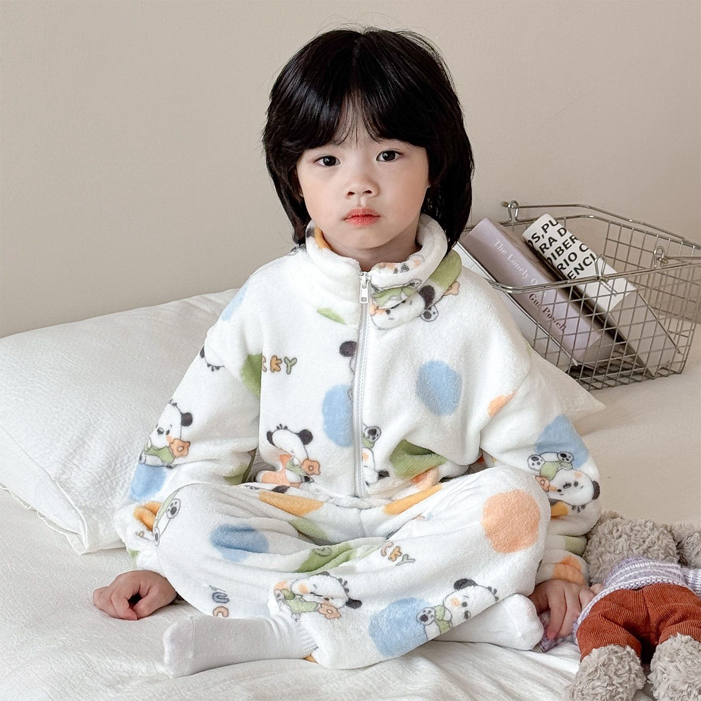 男童睡衣秋冬款珊瑚绒开衫立领套装2025新款儿童法兰绒家居服加厚