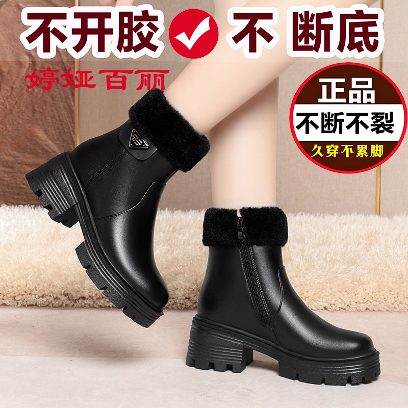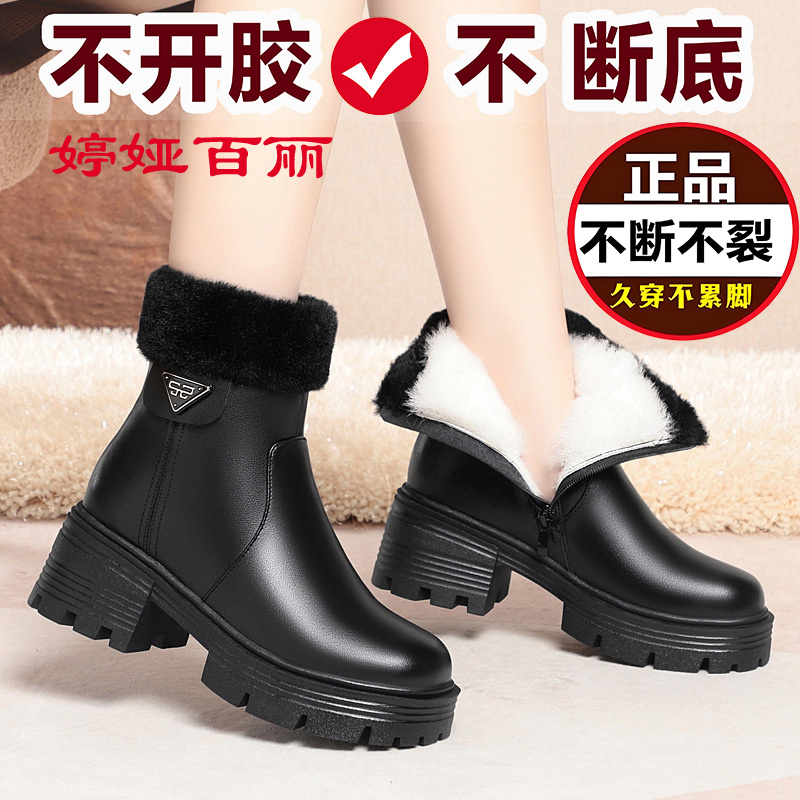 婷娅百丽2025软底软牛皮雪地靴冬季加绒加厚皮毛一体女靴大棉鞋