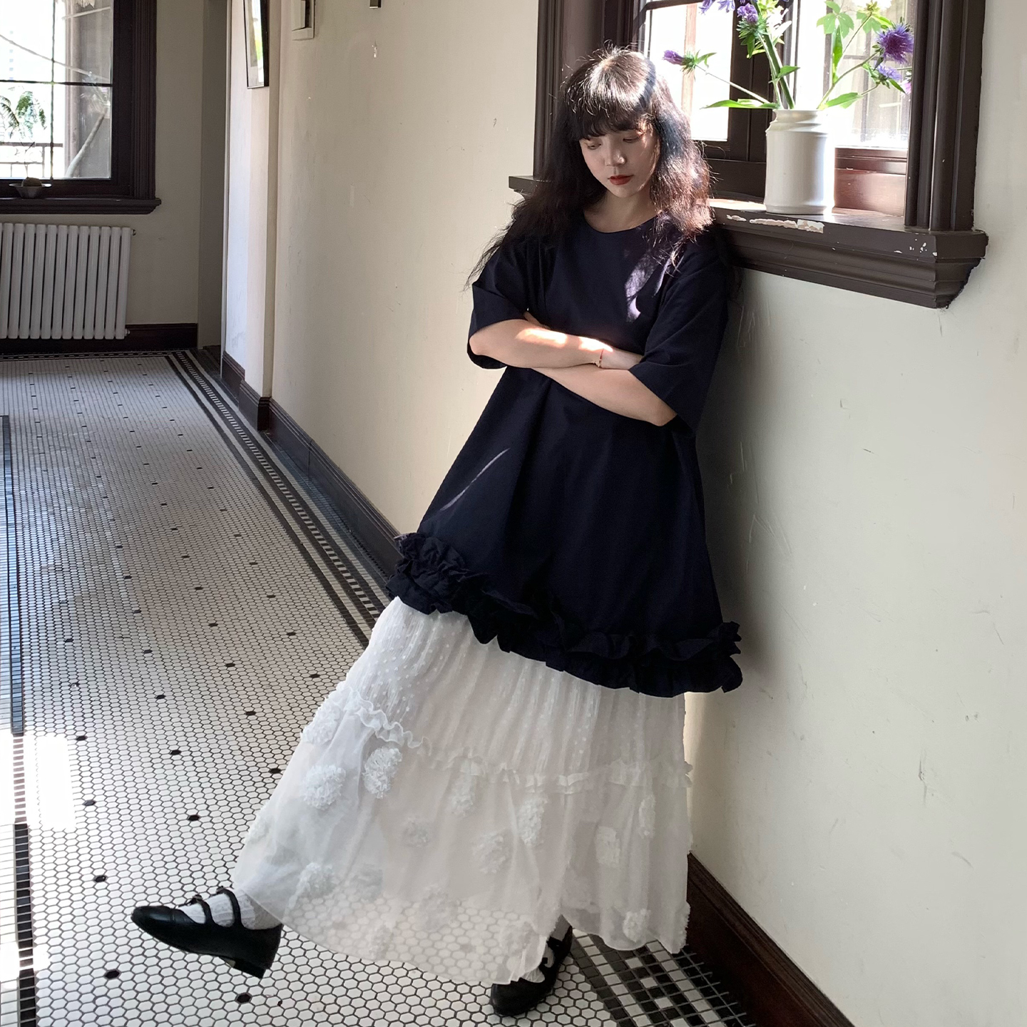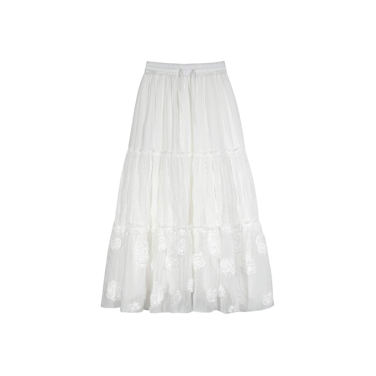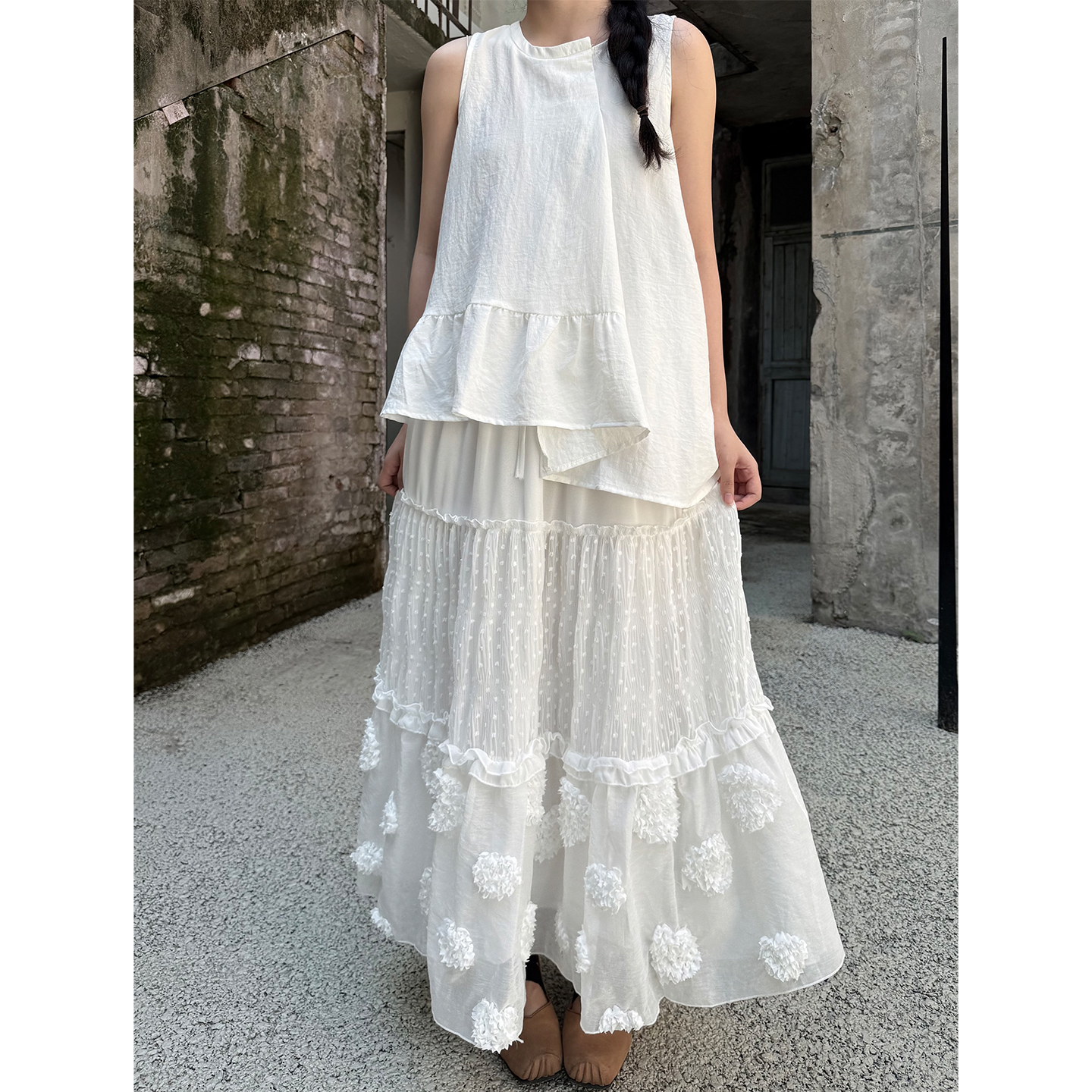 陆与山屿【归梦】夏薄款百褶A字白色长裙拼接面料手工花朵半身裙