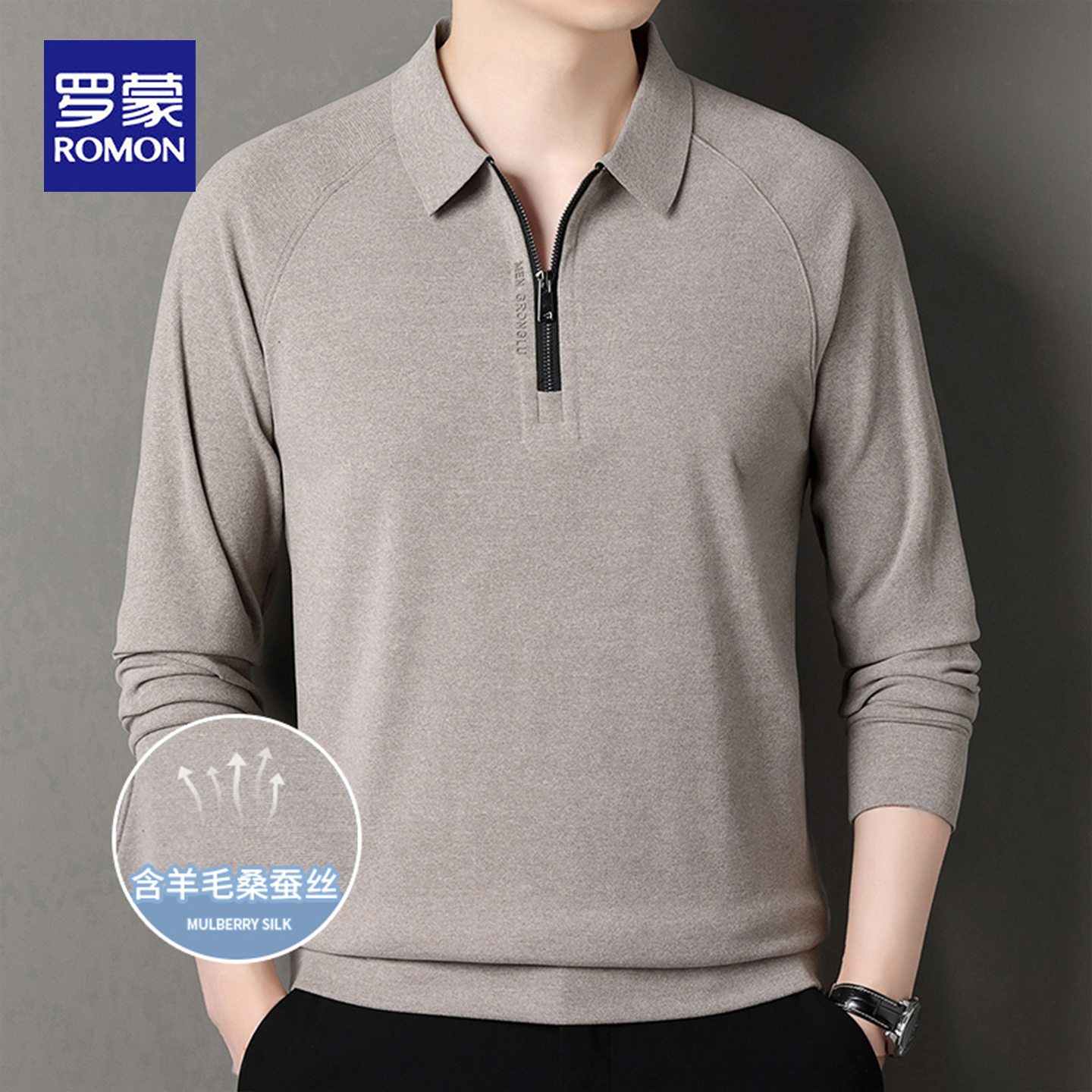罗蒙含羊毛桑蚕丝长袖T恤男士商务休闲春秋新款翻领polo衫上衣男