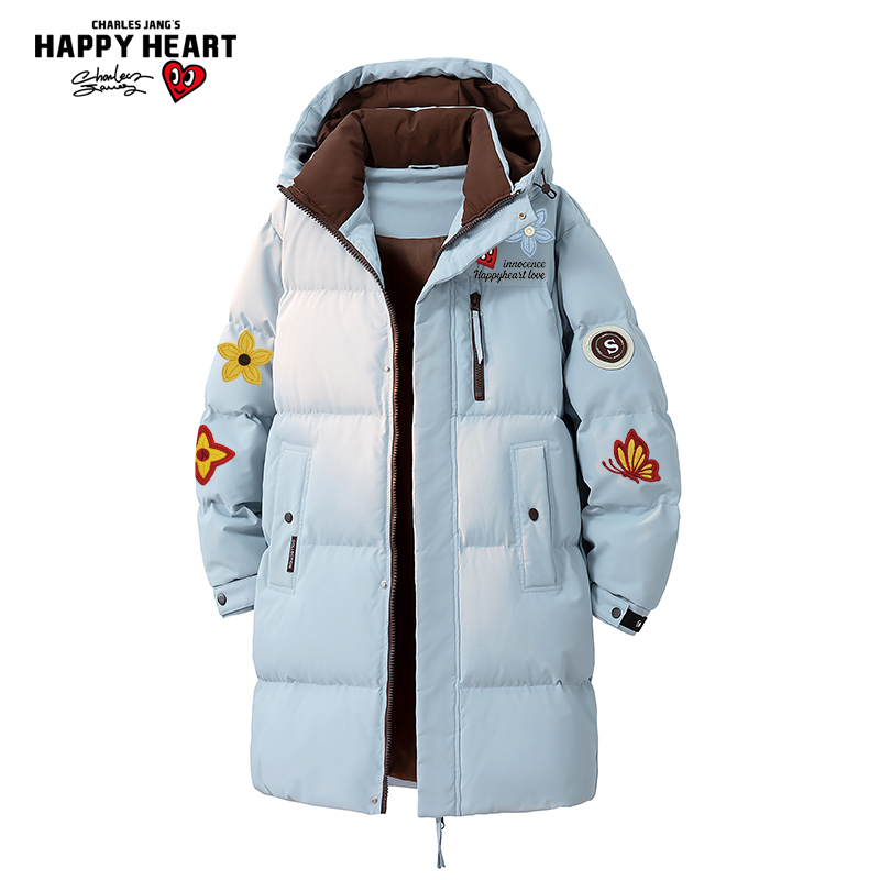 查尔斯桃心 花卉蝴蝶印花中长款棉服男冬季撞色加厚保暖过膝外套