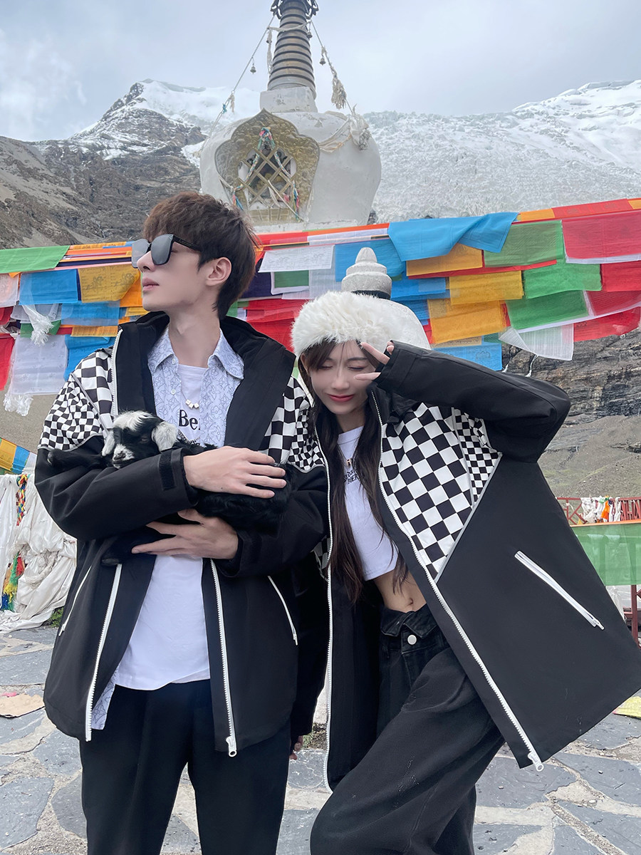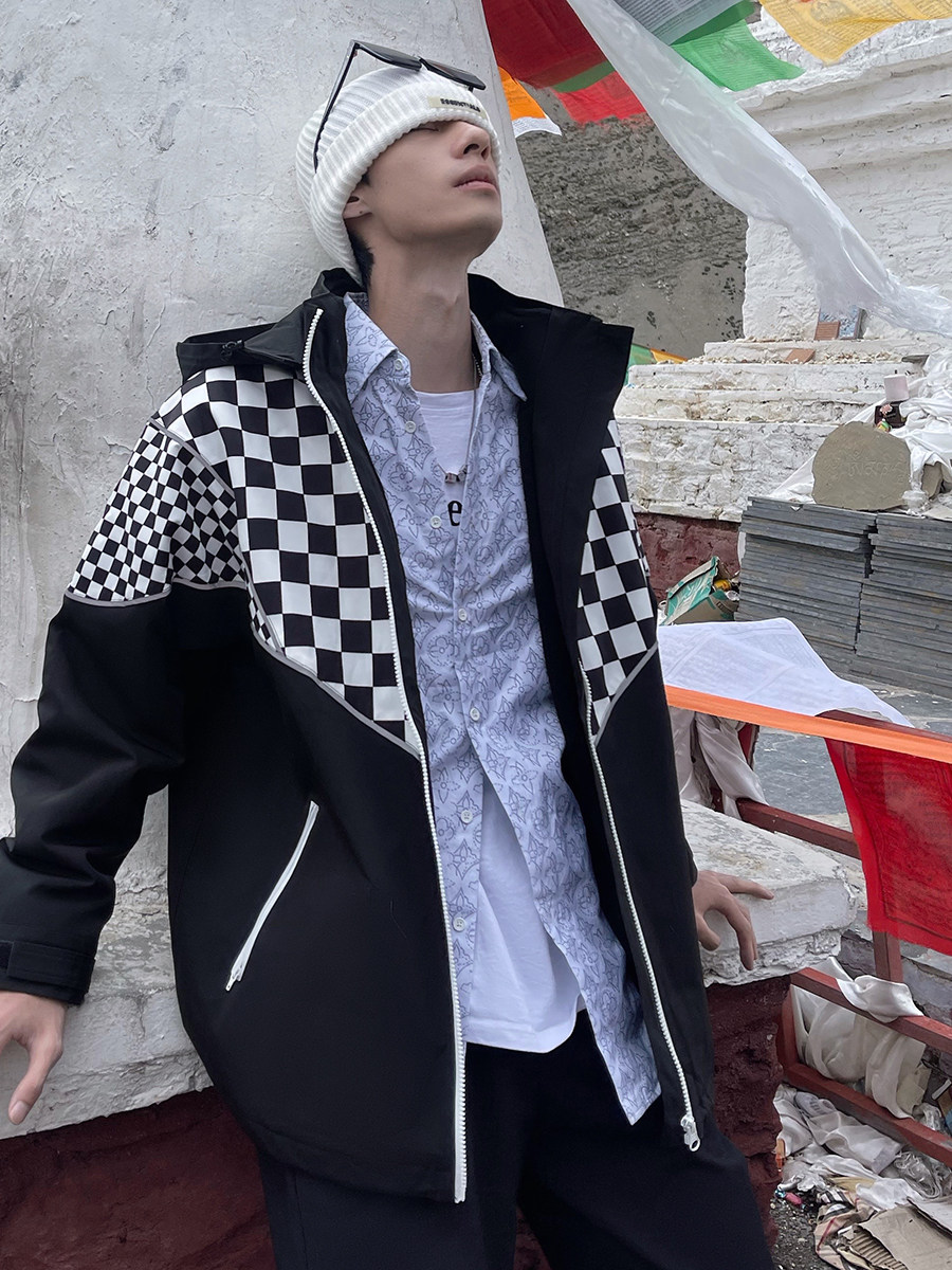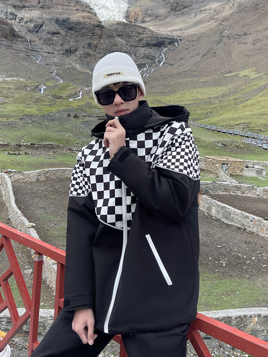 UHMU户外情侣装冲锋衣外套男2025秋冬新款3M码反光黑白格加绒加厚