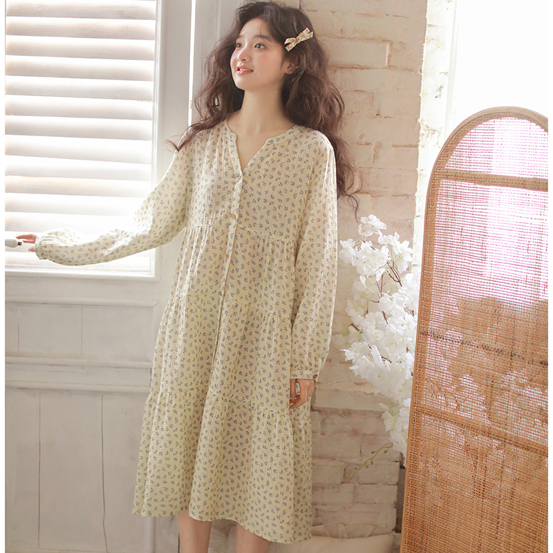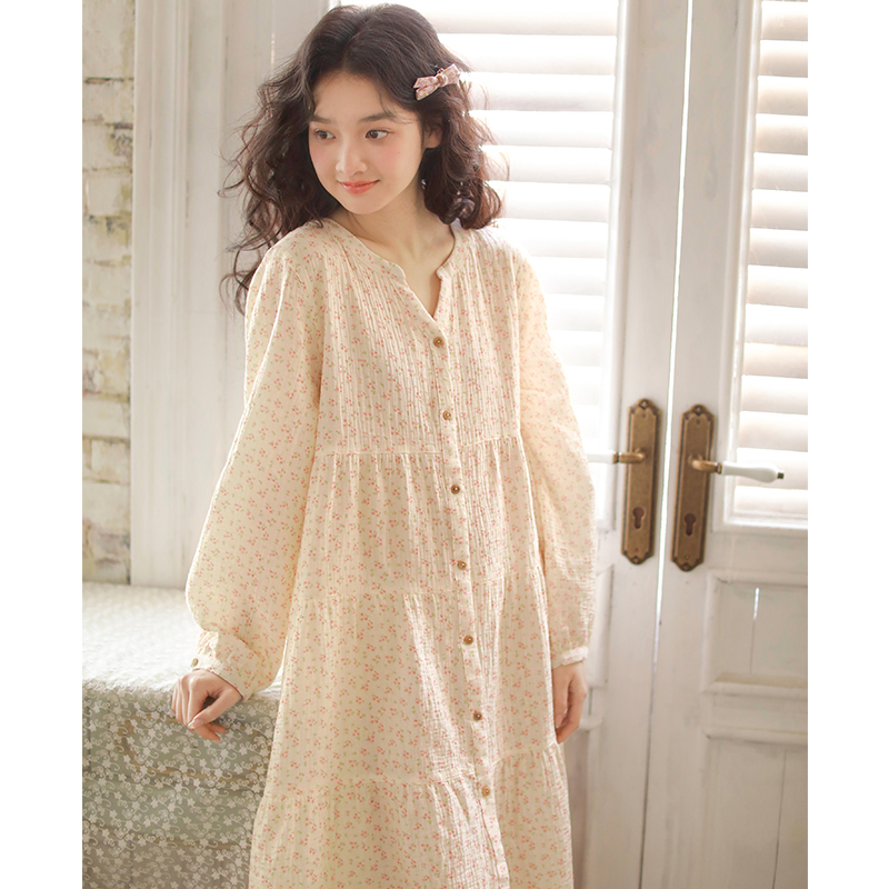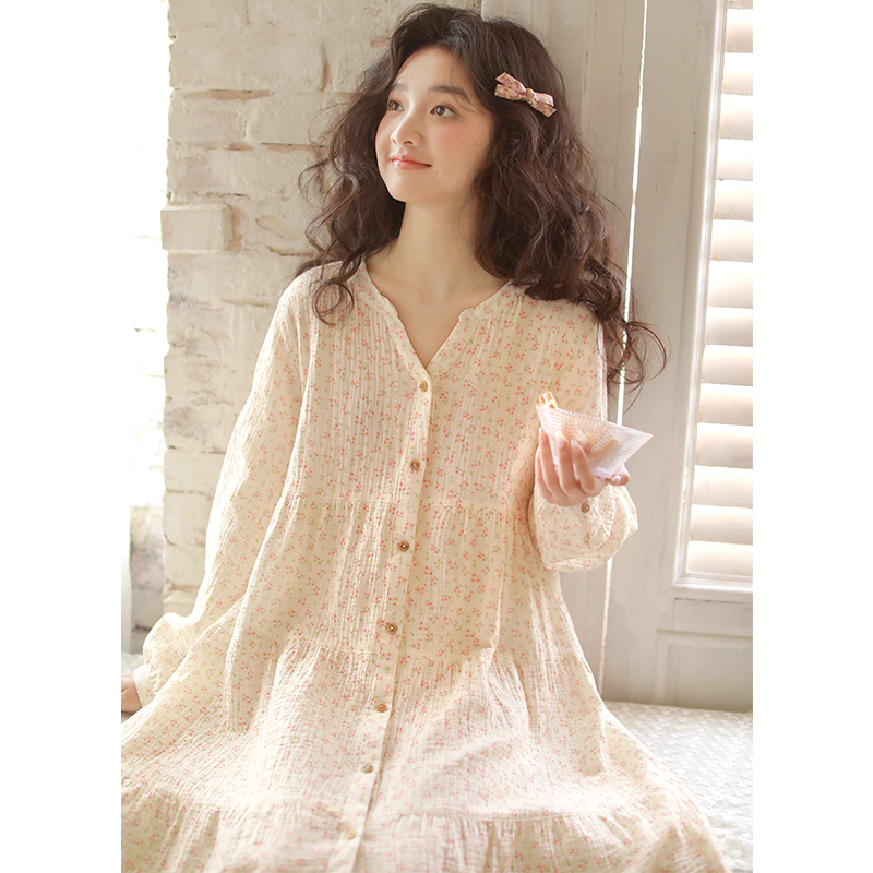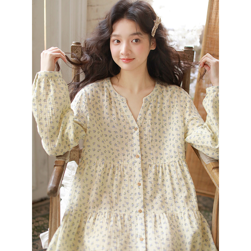 2025春夏新款纯棉睡裙女长袖中长款裙子全棉棉纱小碎花可外穿家居