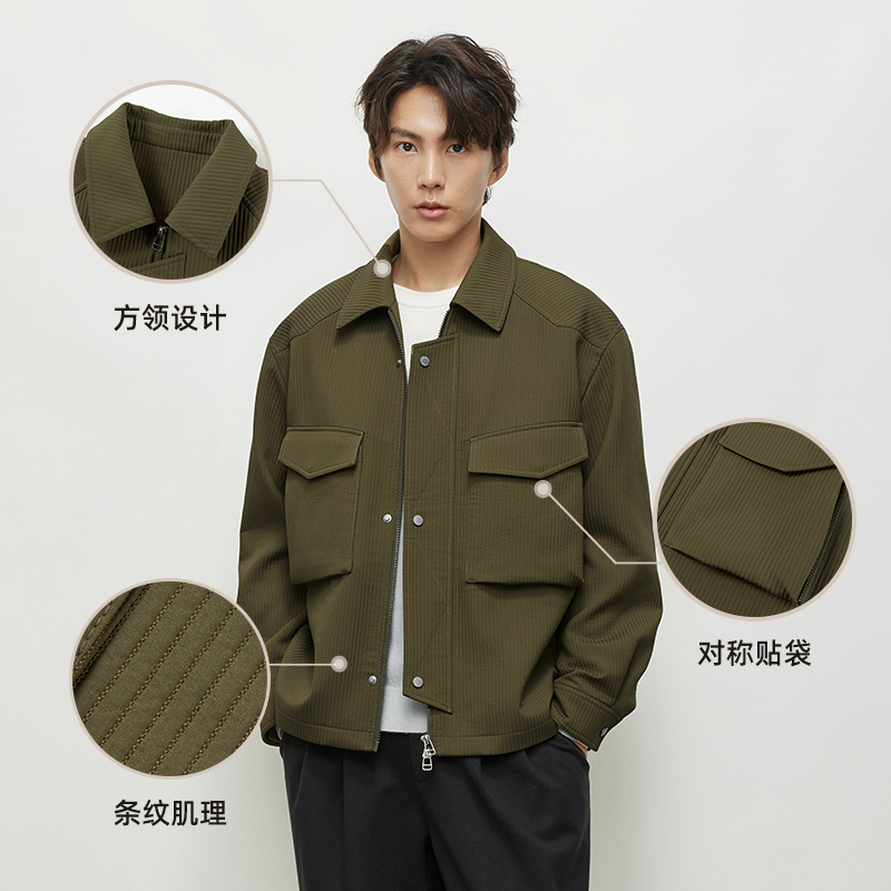 JDV男装春季新款纯色条纹舒适百搭宽松短款拉链方领夹克外套时尚