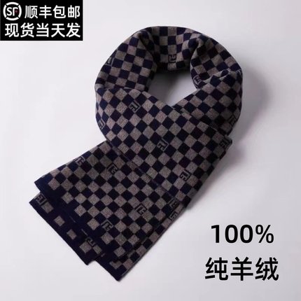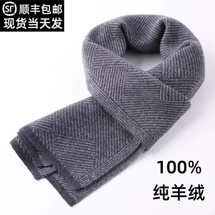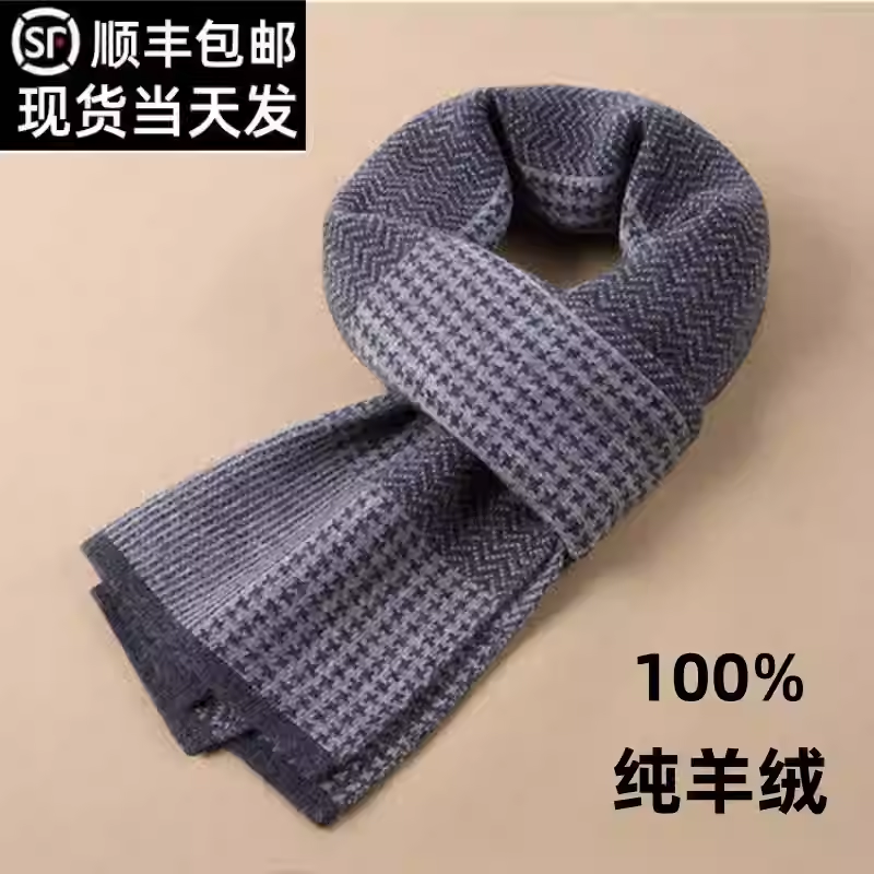 鄂尔多斯市纯山羊绒围巾男士冬季保暖加厚高档男生格子围巾礼盒装