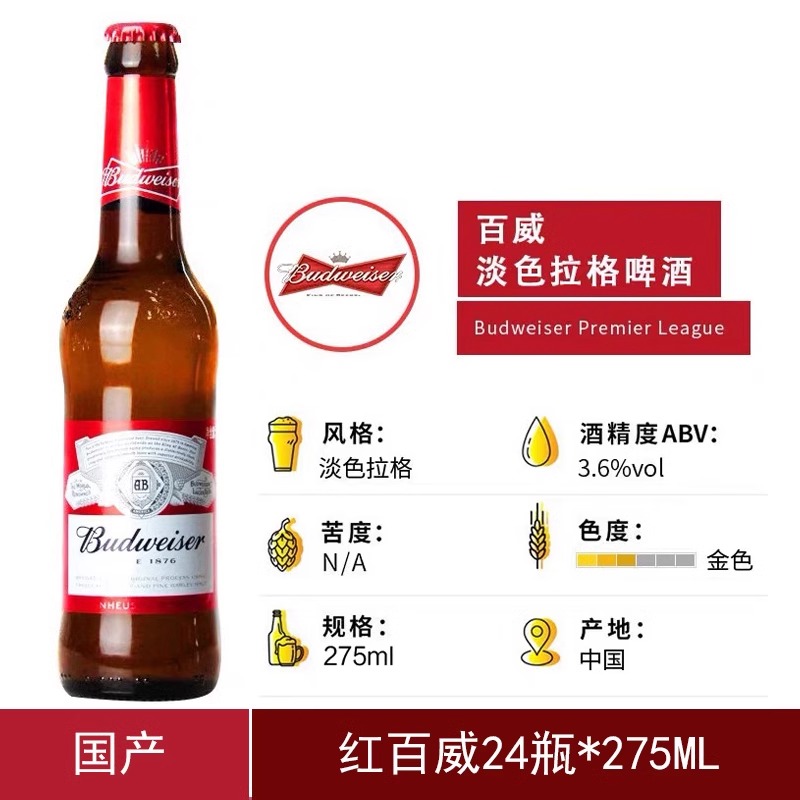 百威啤酒小瓶装啤酒小麦啤酒经典醇正清爽黄啤275ml*24瓶整箱包邮