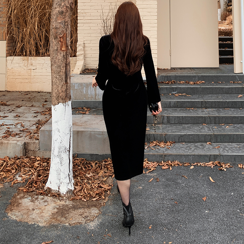 大码女装高级感胖mm新款法式复古金丝绒连衣裙黑色茶歇小黑裙2005