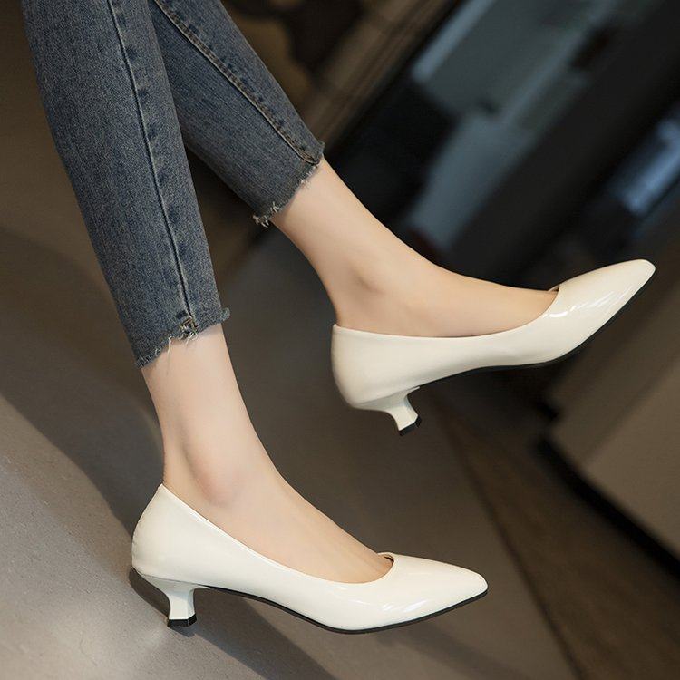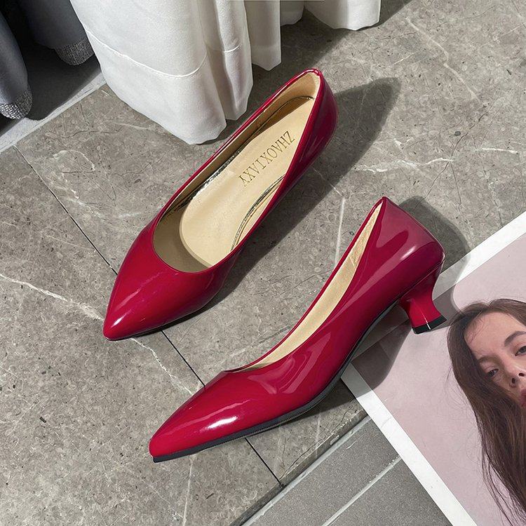 猫跟小红鞋婚鞋春秋低跟3CM细跟亮皮单鞋女酒杯跟细跟尖头工作鞋