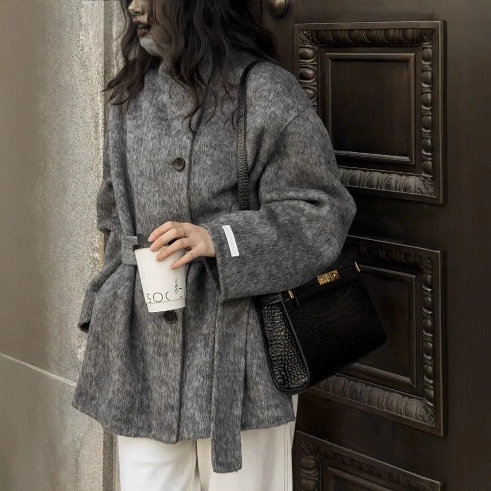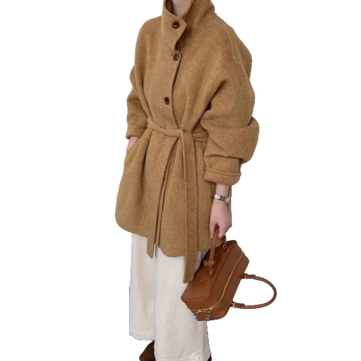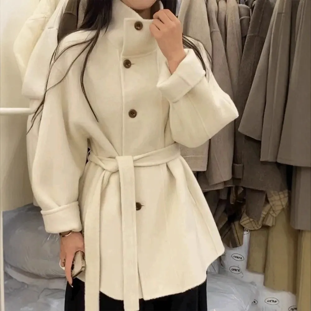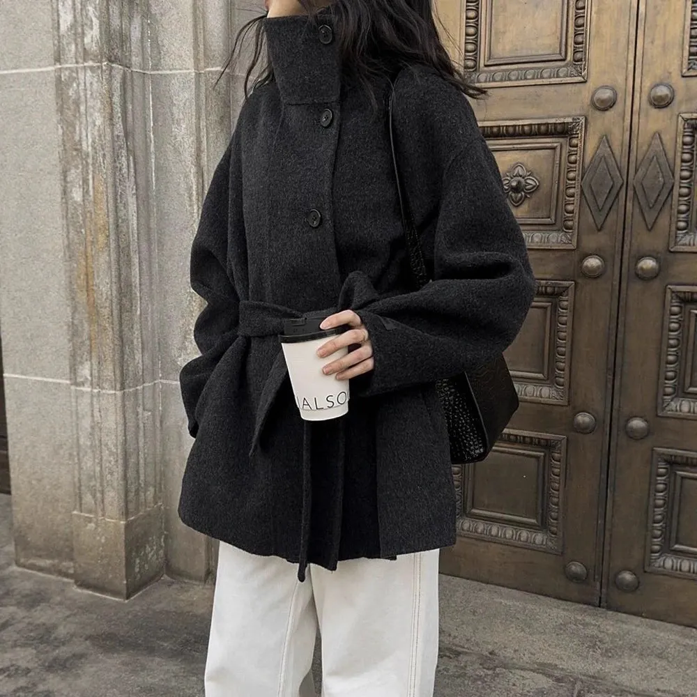 双面羊毛大衣女韩版新款立领系带宽松高级感气质显瘦毛呢外套秋冬