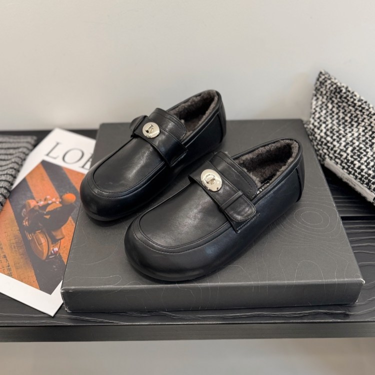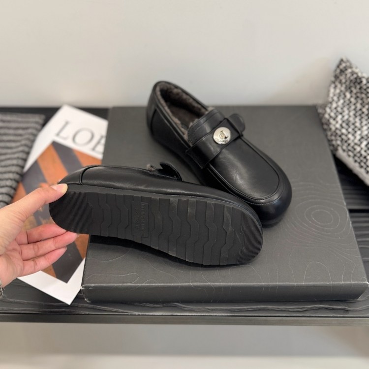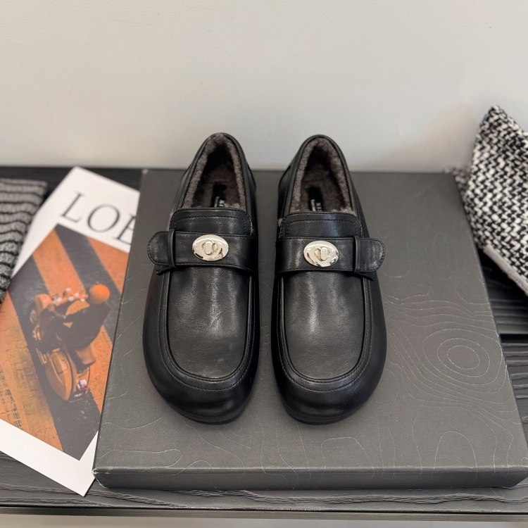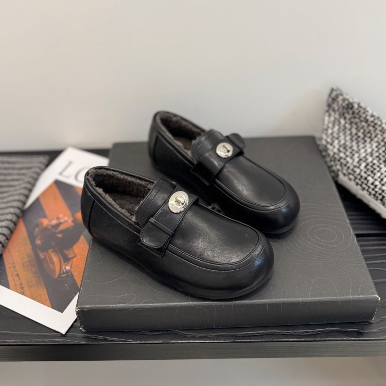 一脚蹬加绒深口单鞋女25冬低跟英伦小皮鞋金属扣圆头乐福鞋勃肯鞋