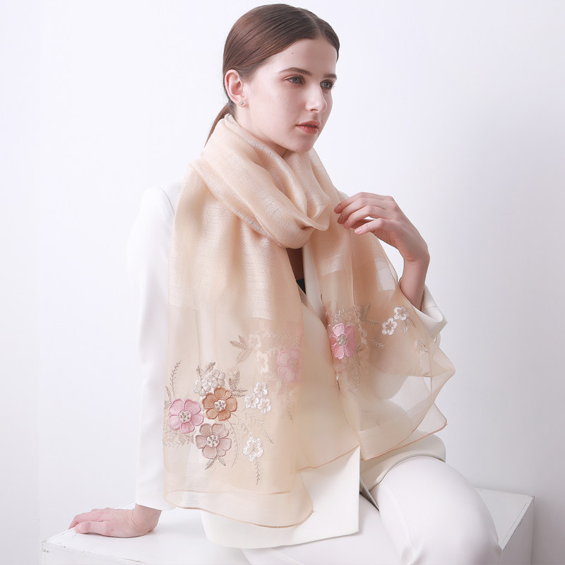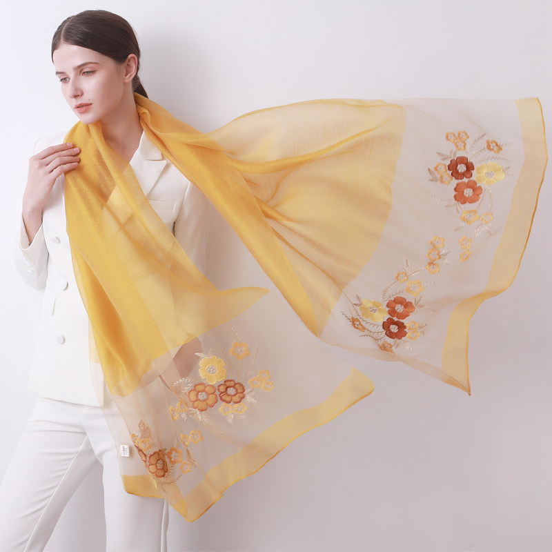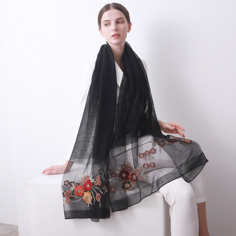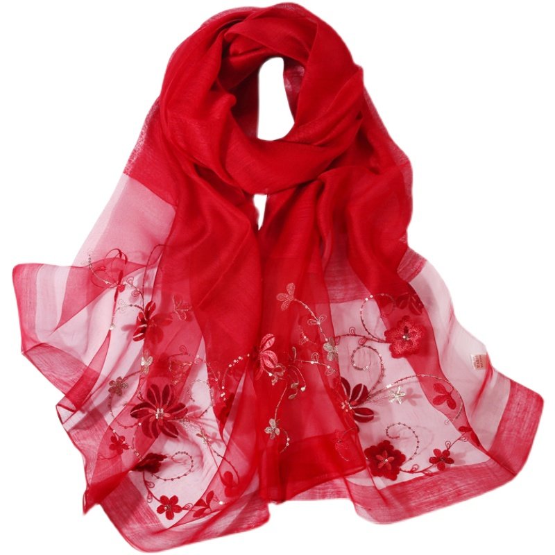 上海故事真丝丝巾女春秋桑蚕丝刺绣围巾纱巾长款红色婚礼绣花披肩