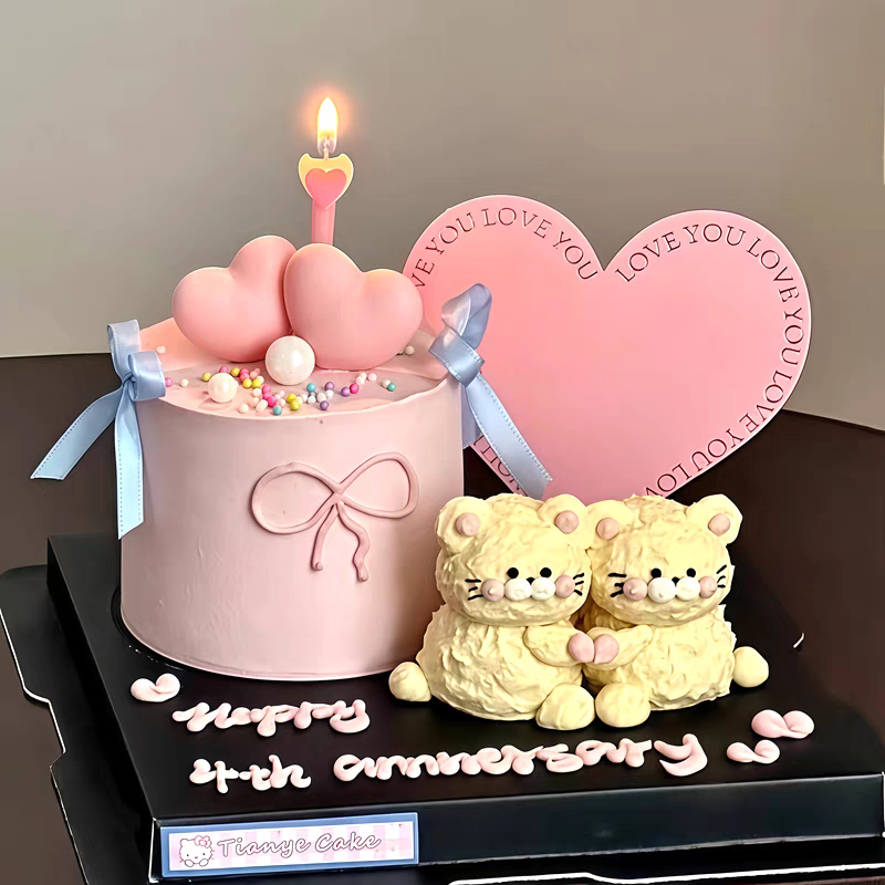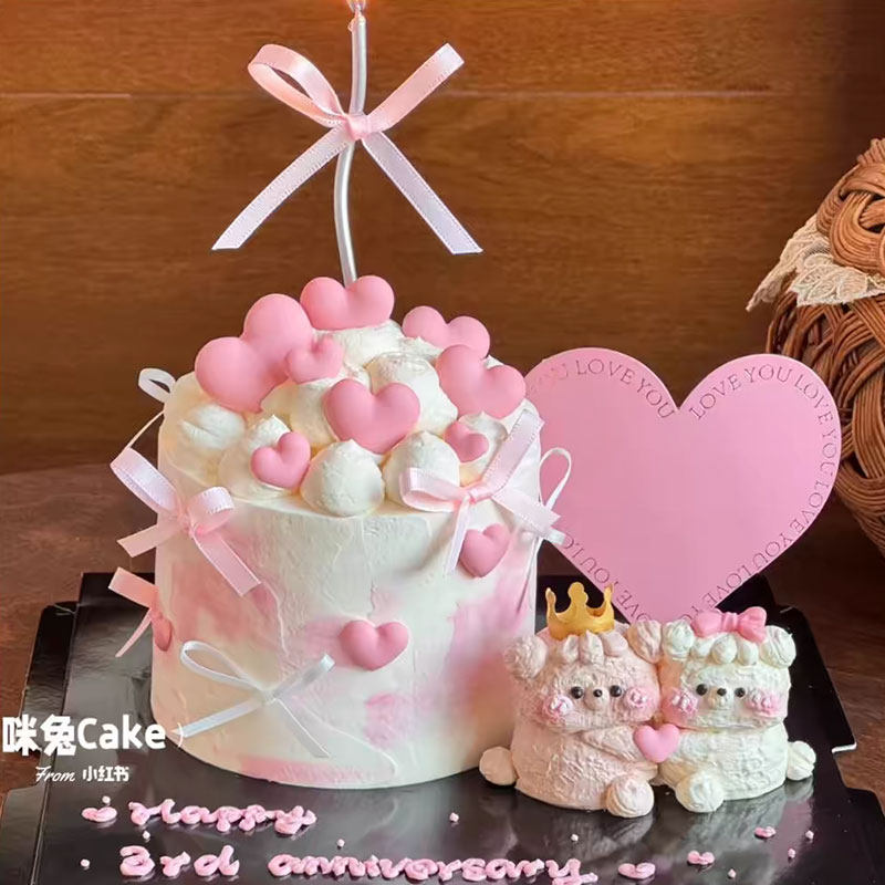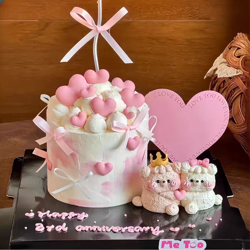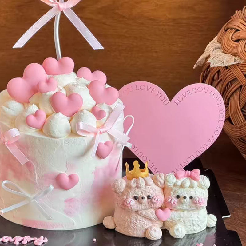 2.14情人节情侣奶油小熊蛋糕装饰摆件告白粉色大爱心卡片丝带插件