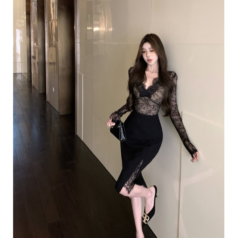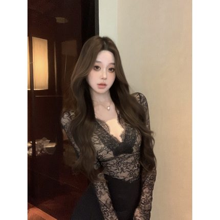 精致名媛风俏皮睫毛蕾丝V领上衣女秋季新款御姐性感显身材打底衫
