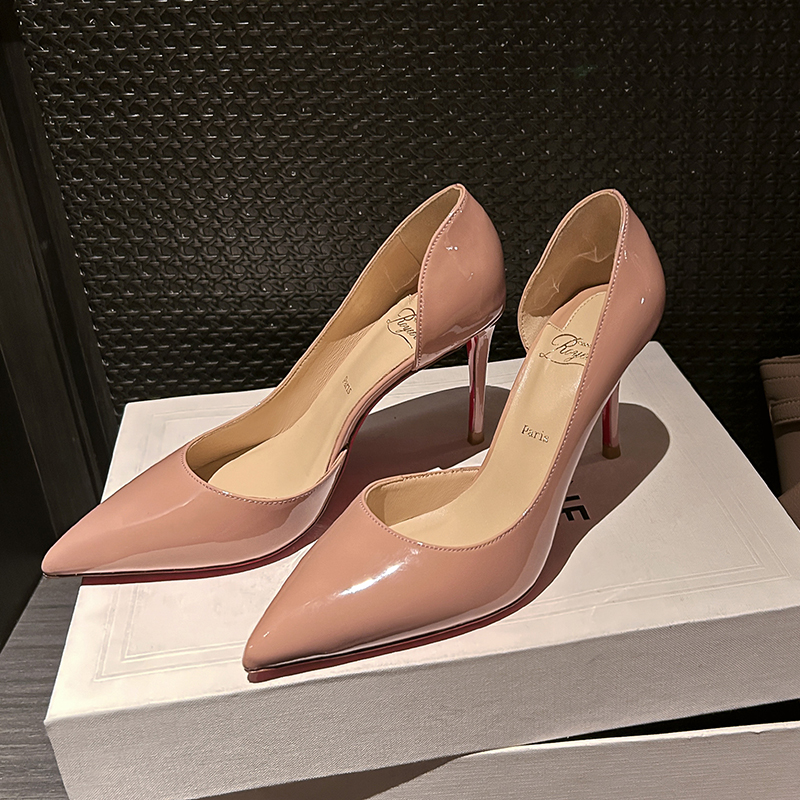 侧空CL尖头高跟鞋女红底细跟单鞋