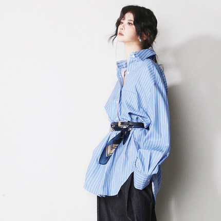 A76显摆清爽蓝色竖条纹加长款慵懒显瘦欧美风防晒长袖男友衬衫