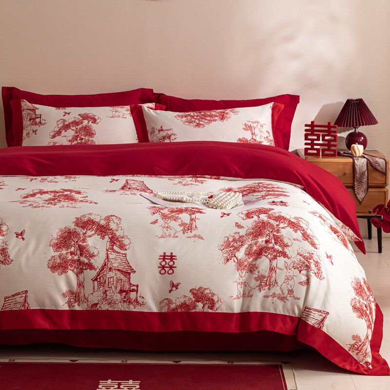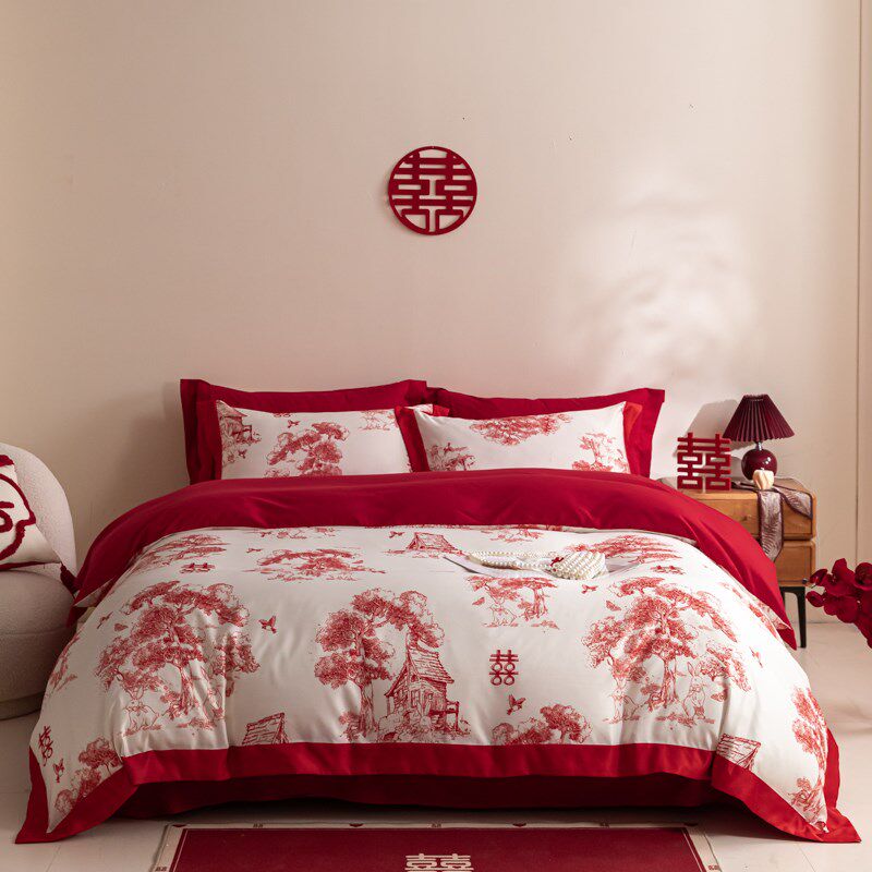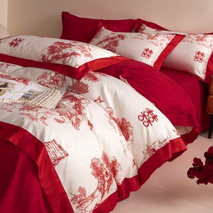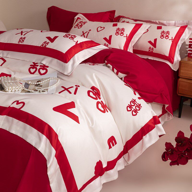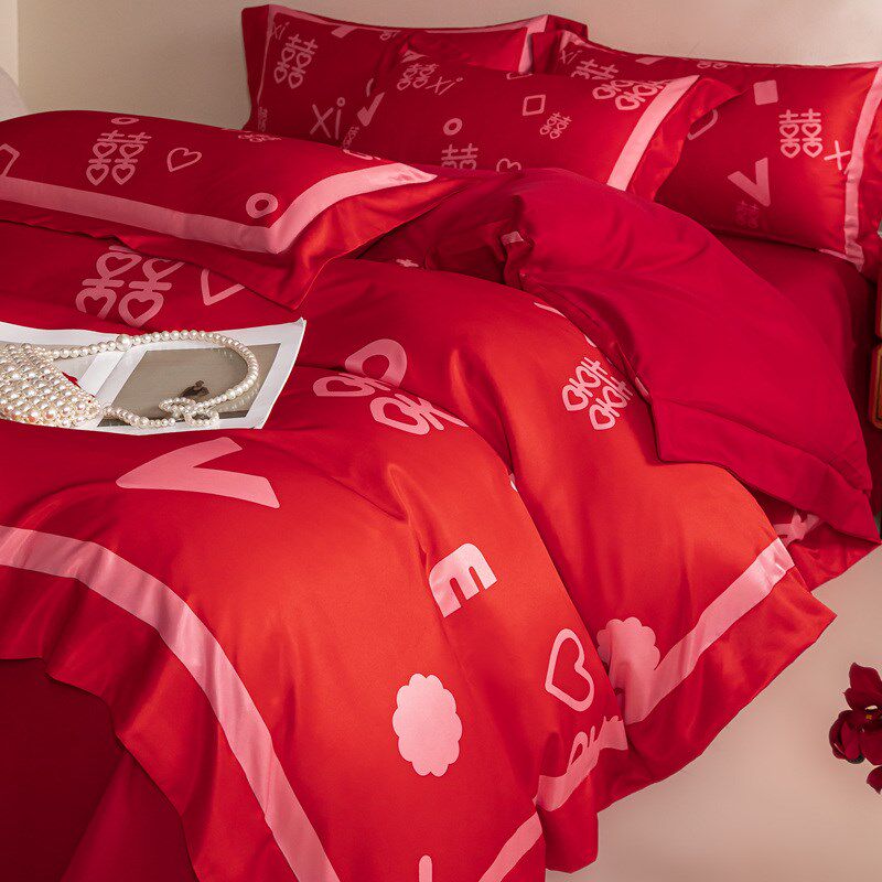 现代100e支结婚四件套婚庆红色被套新婚喜被床单床上用品4