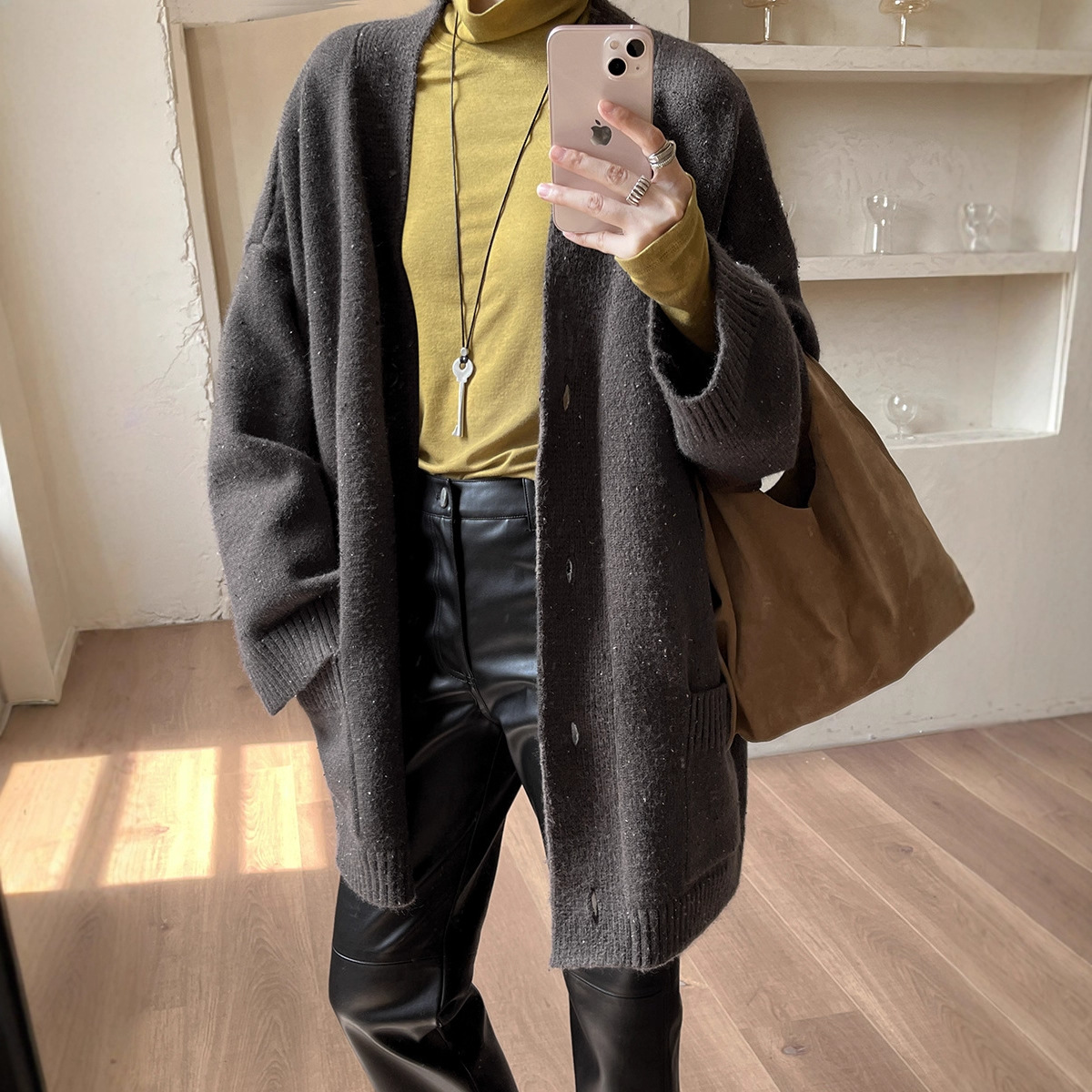 2025秋冬新款V领宽松毛衣慵懒风加厚针织雪花点中长款女外套纽扣