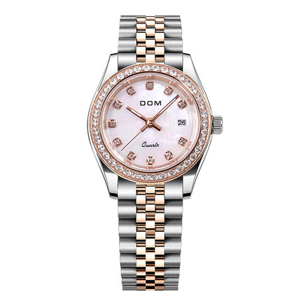 DOM腕表 2024学生新款间金钢带轻奢小众手表女粉色表盘瑞士石英表