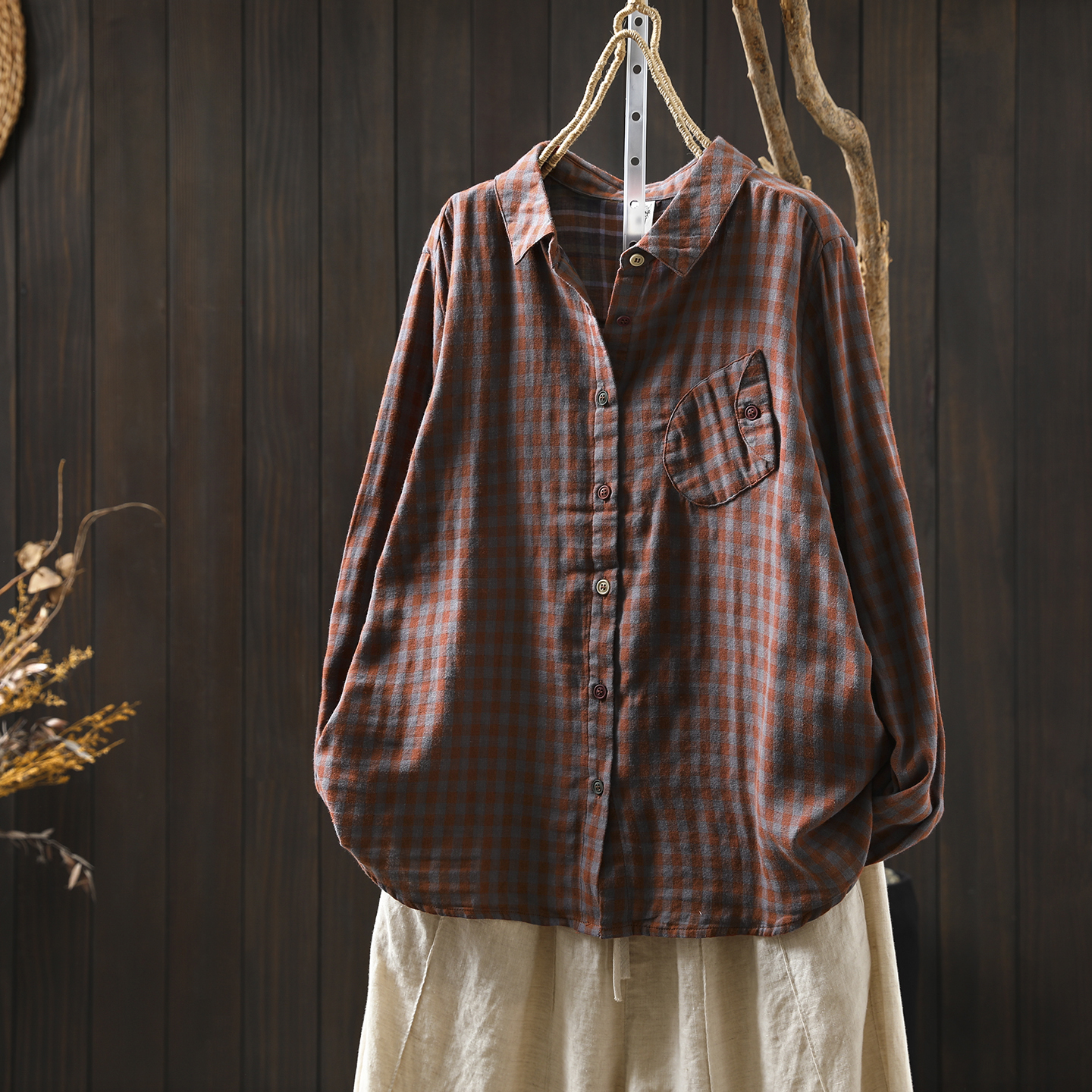 2025独特超好看衬衫女早秋复古格子小众别致口袋宽松休闲长袖衬衣