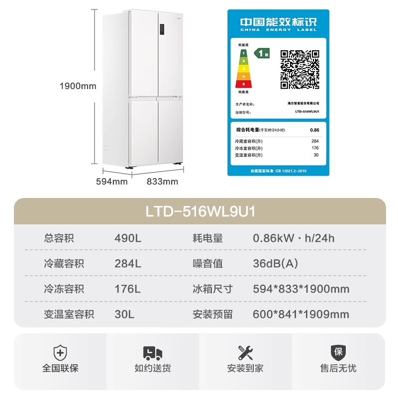海尔统帅电冰箱490L十字四门超薄零嵌入415L家用一级能效风冷无霜