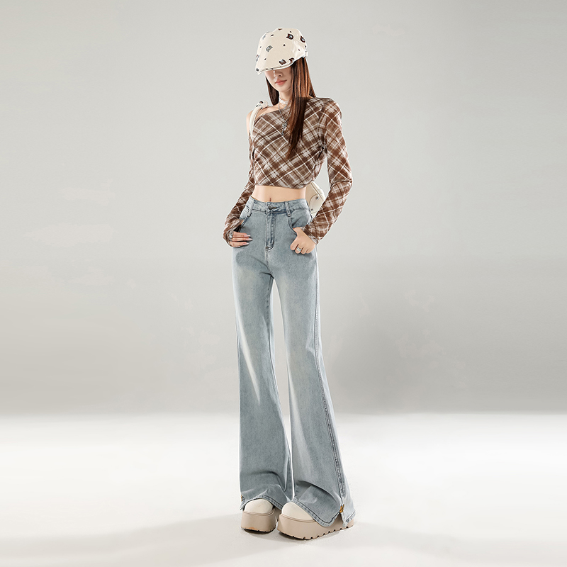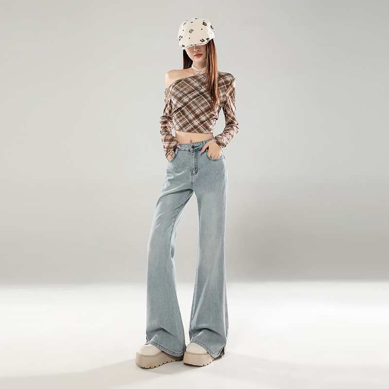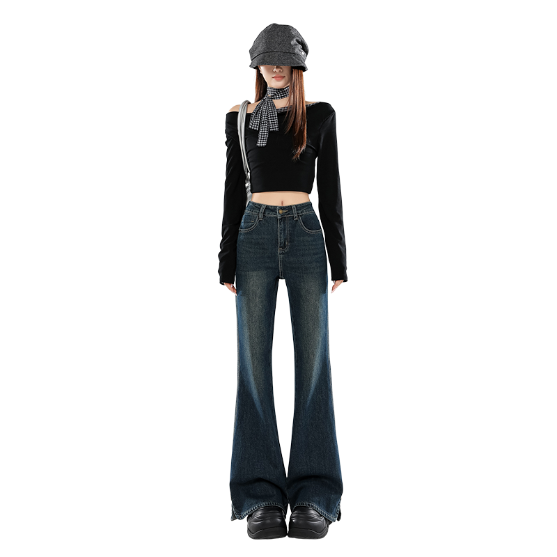 秋冬黑色高腰加厚牛仔裤女宽松显瘦加绒不贴腿黑色微喇叭加长长裤